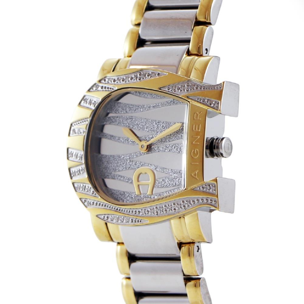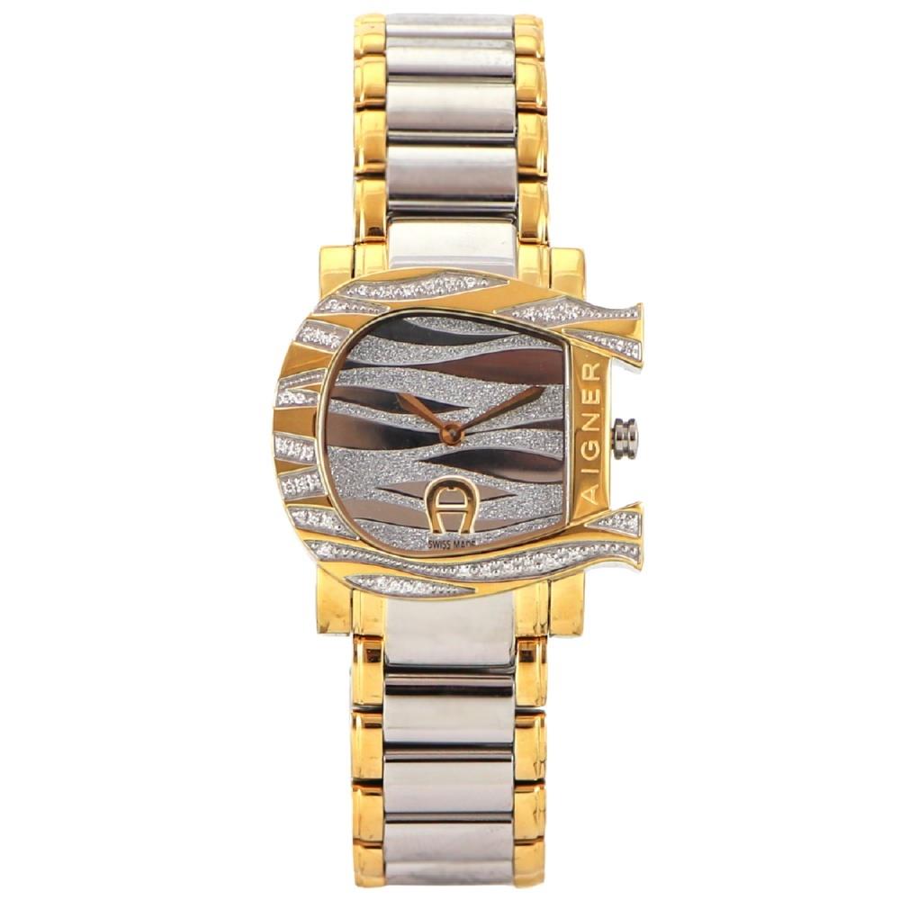ساعت مچی زنانه AIGNER با طراحی کلاسیک بند دو رنگ وقاب متفاوت طلایی استیل مزین به نگین برلیان وصفحه متفاوت طلایی با موتور سوئیسی وانرژی باتری و مقاومت در برابر اب تا عمق 30 متر به همراه 2 سال گارانتی بین المللی اریا زمان