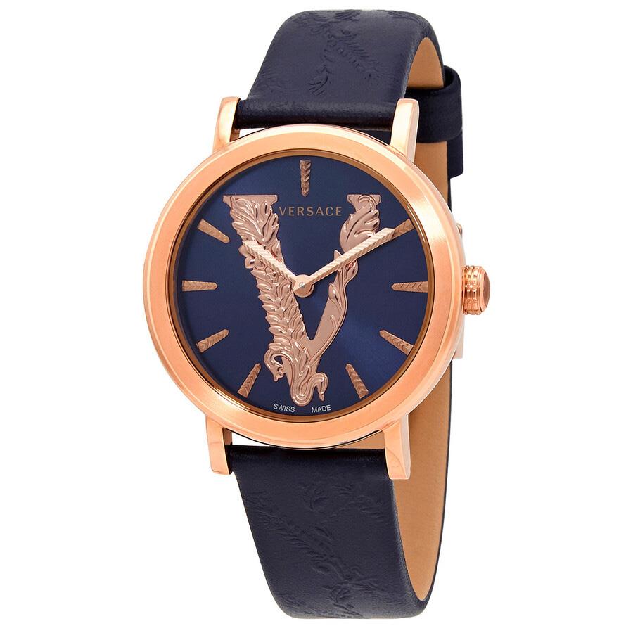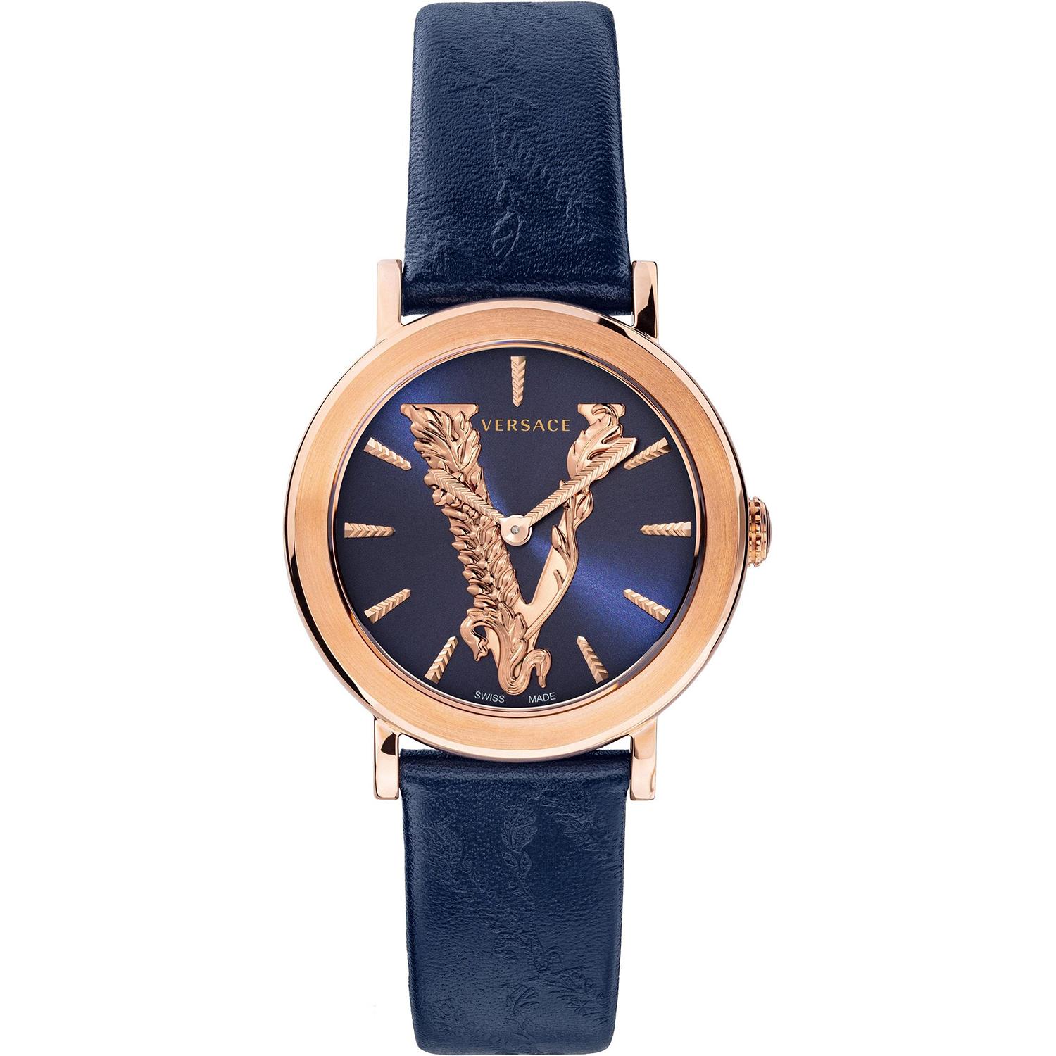 ساعت مچی زنانه Versace ورساچه با طراحی کلاسیک بند چرمی و قاب فلزی مسی و صفحه گرد سرمه ای مسی با موتور سوئیسی و انرژی باتری و مقاومت در برابر اب تا عمق 50 متر به همراه دو سال گارانتی بین المللی اریا زمان