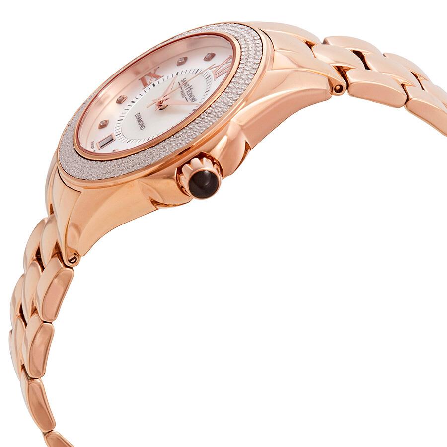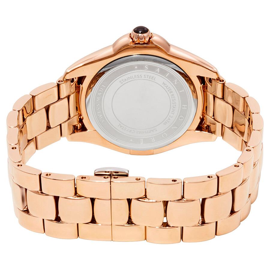 ساعت مچی زنانه Saint Honore سنت هونوره با طراحی روزانه بند و قاب گرد رزگلد دور نگین برلیان و صفحه گرد سفید مزین به نگین برلیان با قابلیت داشتن  تقویم و موتور سوئیسی با انرژی باتری و مقاومت در برابر اب تاعمق 30 متر به همراه دو سال گارانتی بین المللی