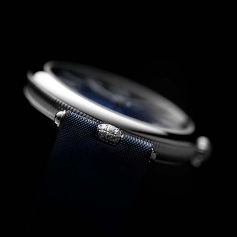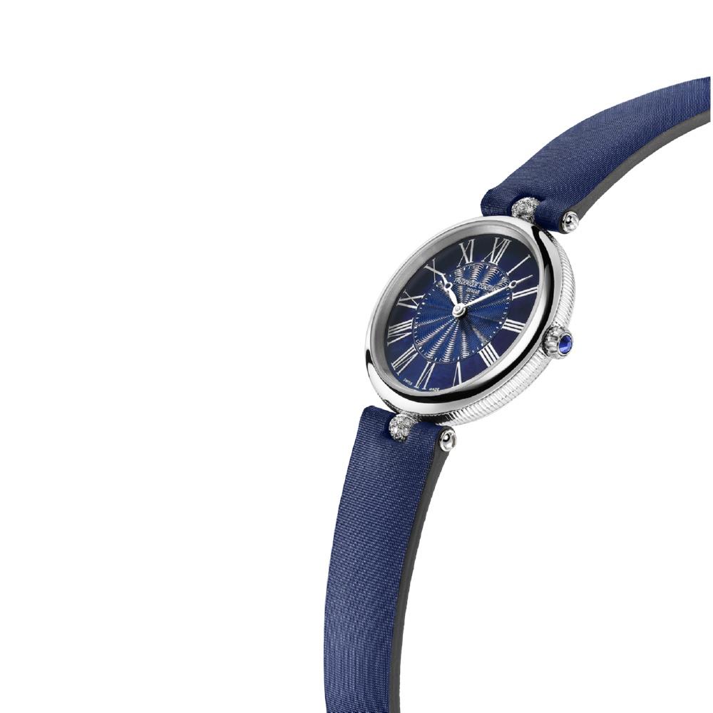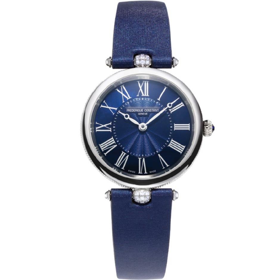 ساعت مچی زنانه  فردریک کنستانت FREDERIQUE CONSTANT با طراحی کلاسیک بند ساتن سرمه ای با قاب گرد استیل مزین به نگین برلیان و صفحه گرد سرمه ای با شیشه ضد خراش و موتورسوییسی با انرژی باتری و مقاوم در برابر آب تا عمق 50 متر به همراه دو سال گارانتی بین المللی