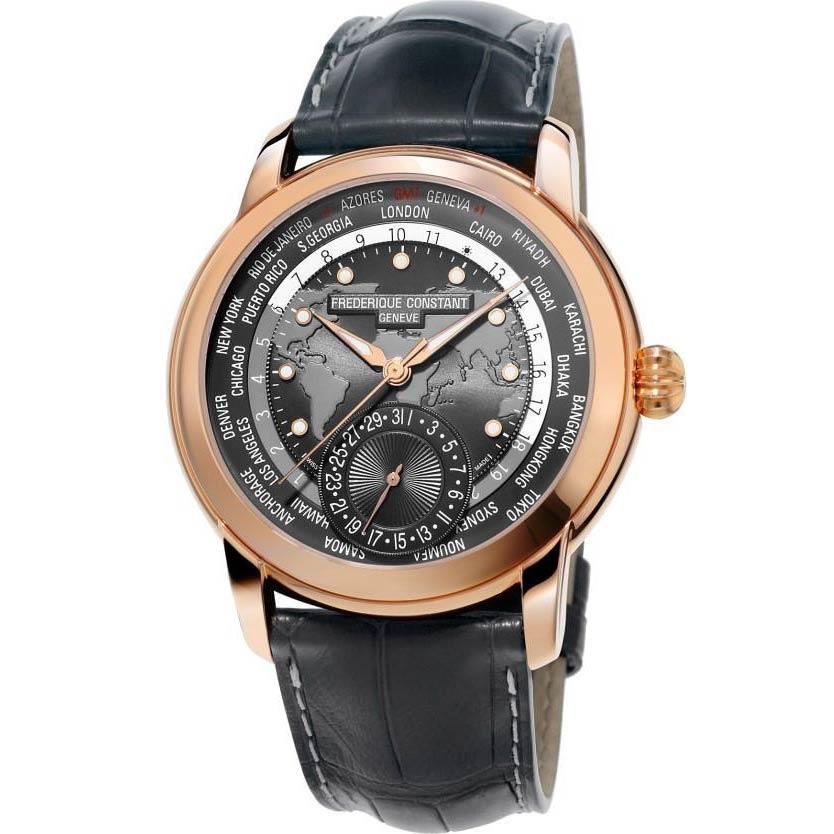 ساعت مچی مردانه FREDERIQUE CONSTANT با طراحی روزانه بند چرمی مشکی با قاب گرد مسی و صفحه گرد طوسی و شیشه ضد خراش با قابلیت داشتن ساعت کشورها , تقویم , قفل کلیپسی , دو زمانه ,شب نما و موتور اتوماتیک سوییسی با انرژی مکانیکی و مقاوم در برابر آب تا عمق 50 متر به همراه دو سال گارانتی بین المللی