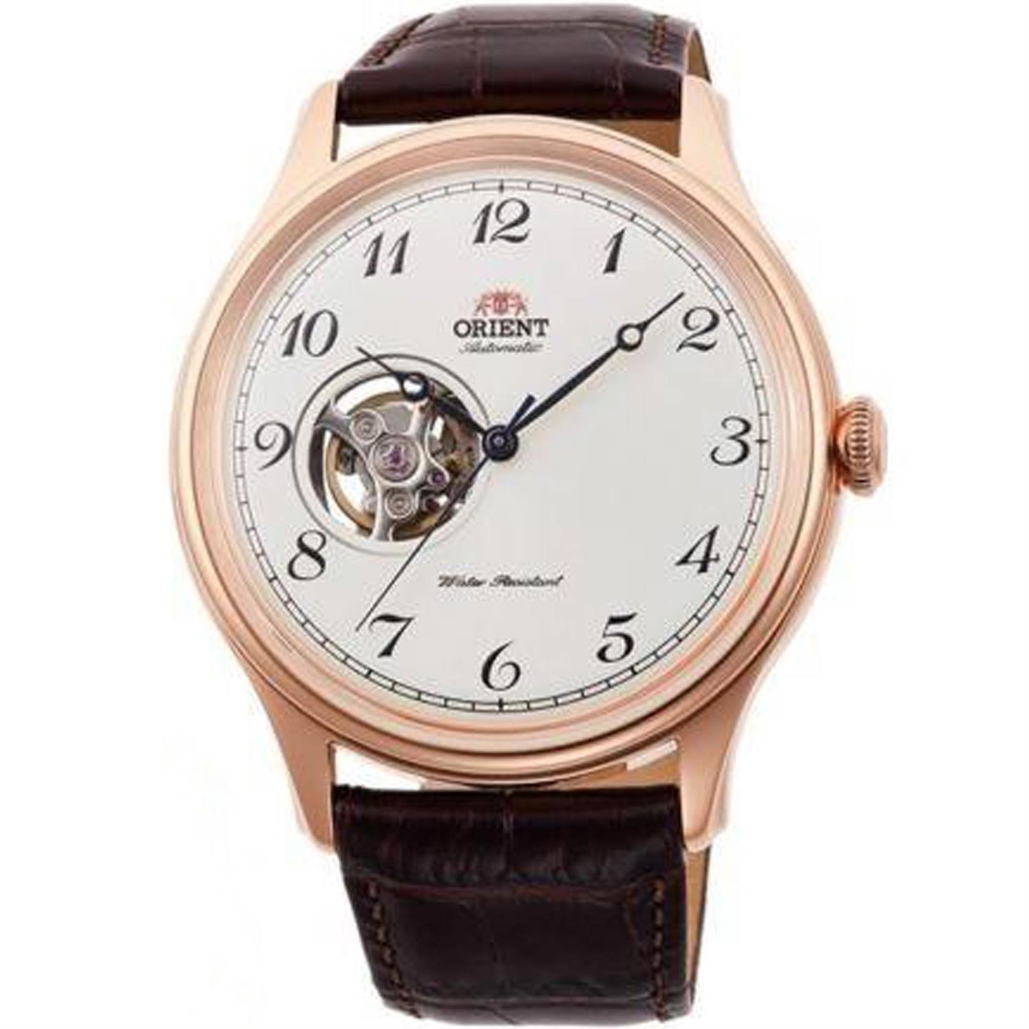 ساعت مچی مردانه اورینت orient با طراحی کلاسیک بند چرمی قهوه ای قاب گرد فلزی مسی و صفحه گرد سفید قلب باز و موتور اتوماتیک ژاپنی با انرژی مکانیکی و مقاومت در برابر تا عمق 50 متر به همراه دو سال گارانتی بین المللی