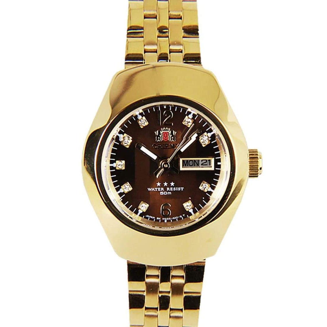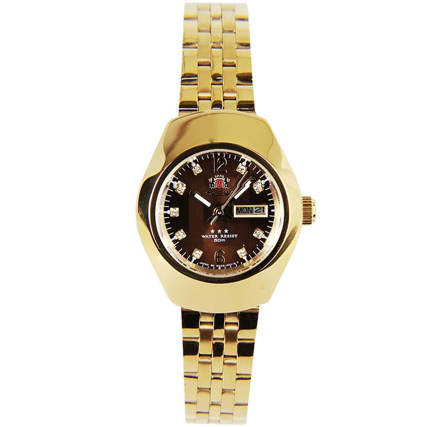 ساعت مچی زنانه اورینت ORIENT با طراحی کلاسیک بند فلزی طلایی و قاب گرد طلایی و صفحه گرد قهوه ای مزین به نگین با قابلیت داشتن تقویم , روزهای هفته , شب نما و موتورژاپنی اتوماتیک با انرژی مکانیکی و مقاومت در برابر اب تا عمق 50 متربه همراه دو سال گارانتی بین المللی