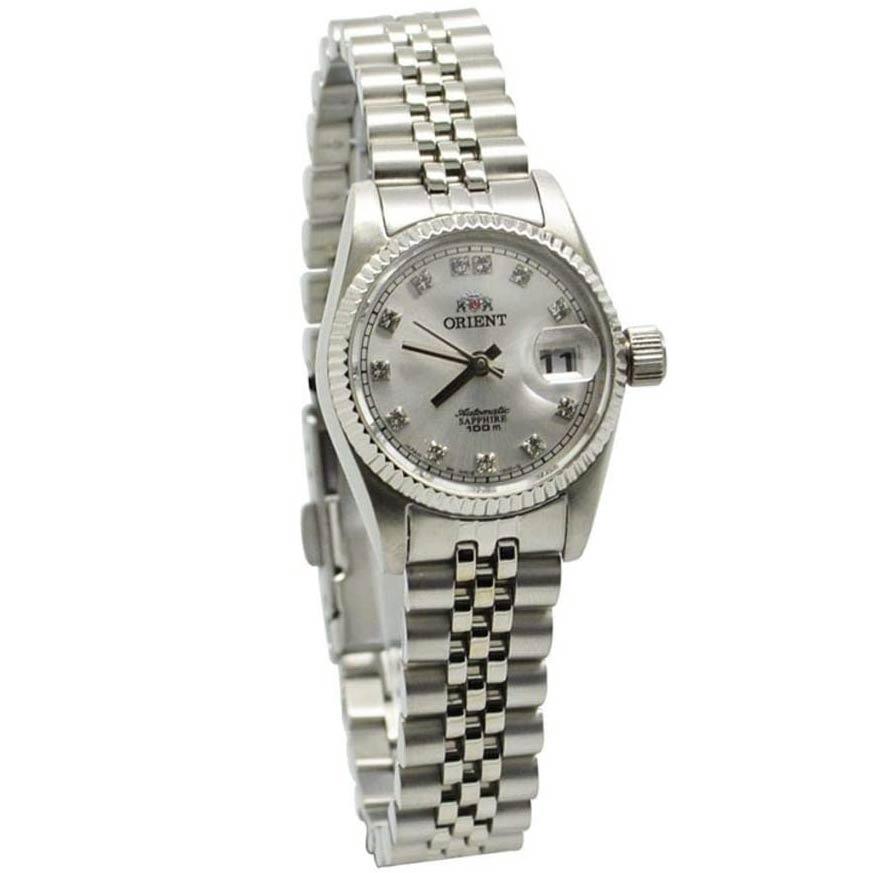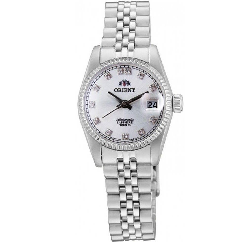 ساعت مچی زنانه اورینت ORIENT با طراحی کلاسیک بند استیل و قاب گرد استیل و صفحه گرد نقره ای مزین به نگین با قابلیت داشتن تقویم و موتور سوئیسی با انرژی باتری و مقاومت در برابر اب تا عمق 100 متر به همراه دو سال گارانتی بین المللی