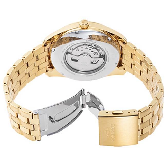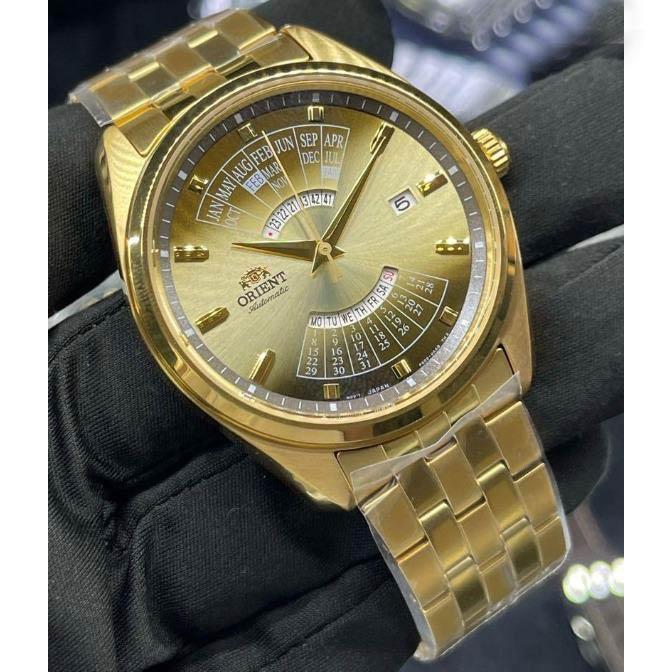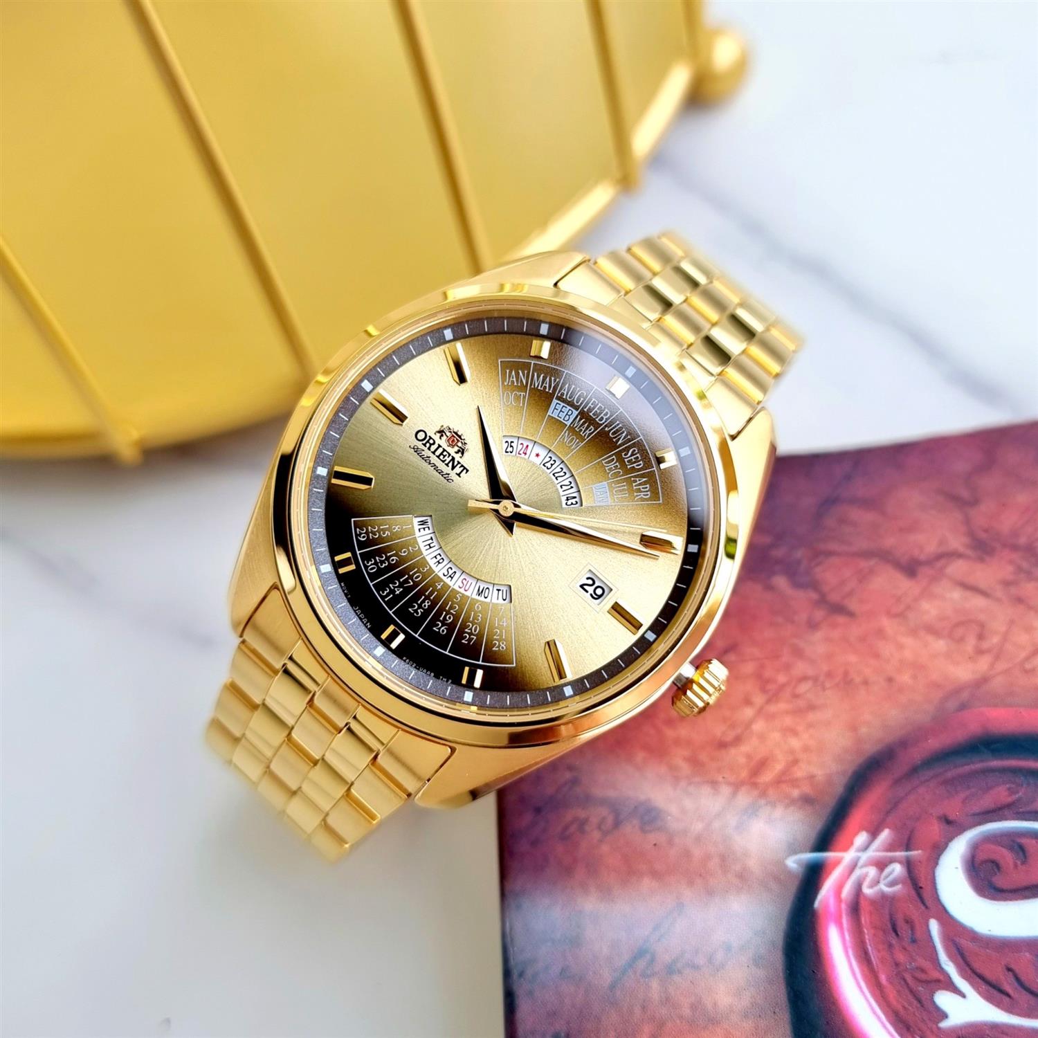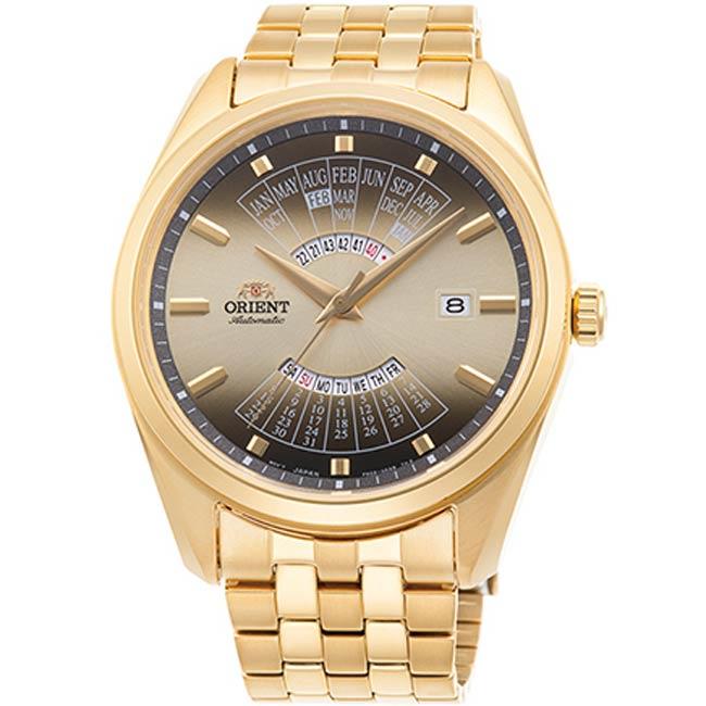 ساعت مچی مردانه اورینت ORIENT با طراحی روزانه بند فلزی طلایی و قاب گرد فلزی طلایی و صفحه گرد قهوه ای و موتور اتوماتیک ژاپنی با انرژی مکانیکی با قابلیت داشتن تقویم , روزهای هفته, نمایش ماه میلادی و مقاومت در برابر اب تا عمق 50 متربه همراه دو سال گارانتی بین المللی