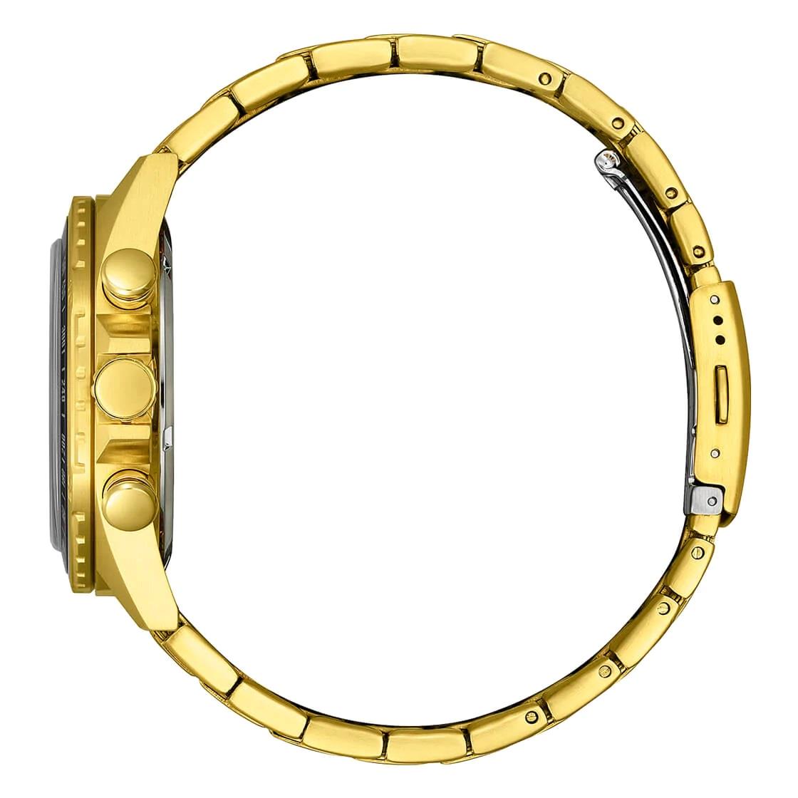 ساعت مچی مردانه سیتی زن CITIZEN با طراحی کلاسیک بند فلزی طلایی و قاب گرد طلایی و صفحه گرد مشکی و موتور ژاپنی و انرژی باتری با قابلیت داشتن تقویم , کرنوگراف , شب نما , زه تاچی متر و مقاومت در برابر اب تا عمق 100 متر به همراه دو سال گارانتی بین المللی