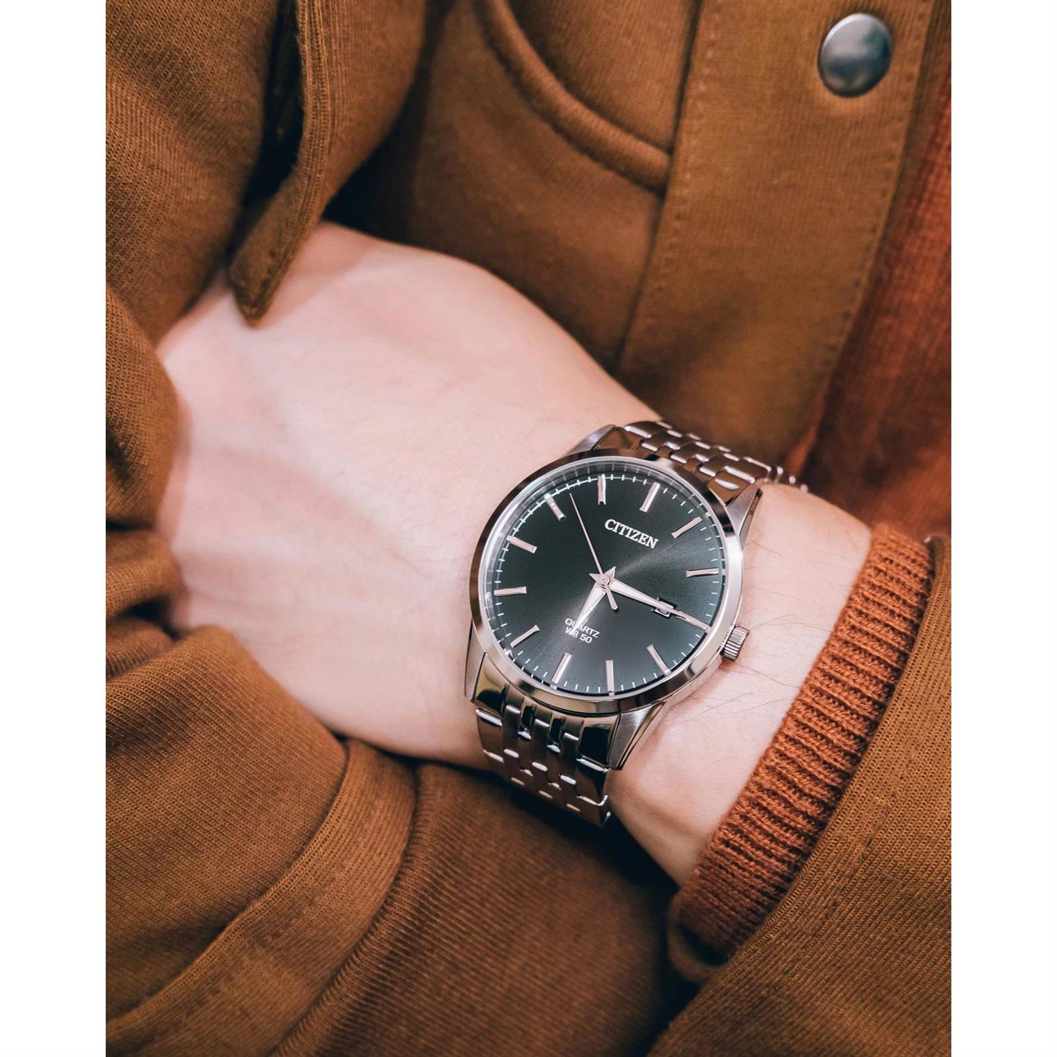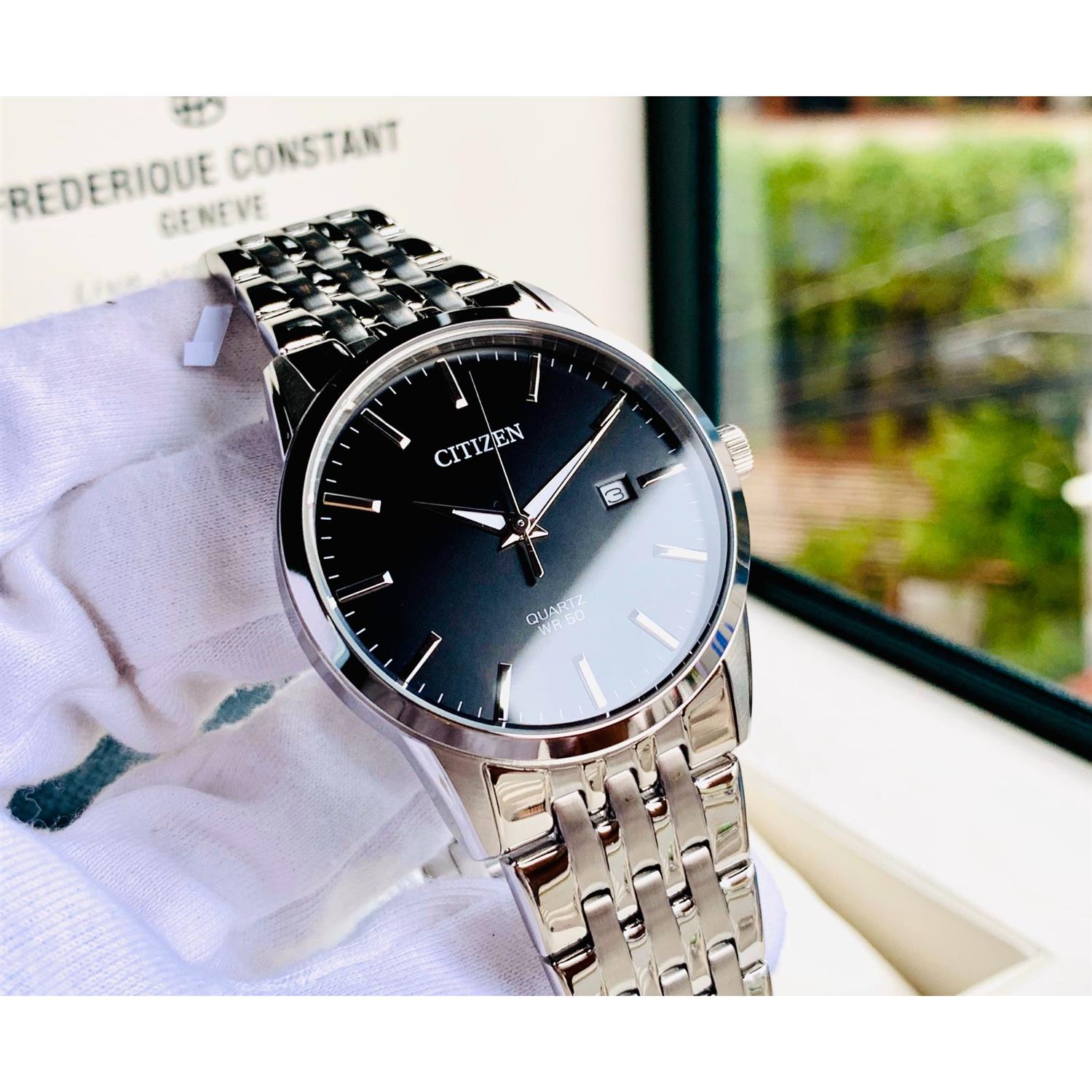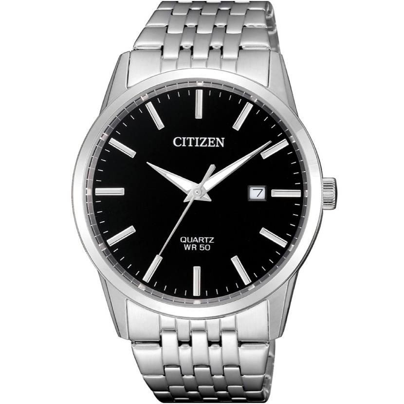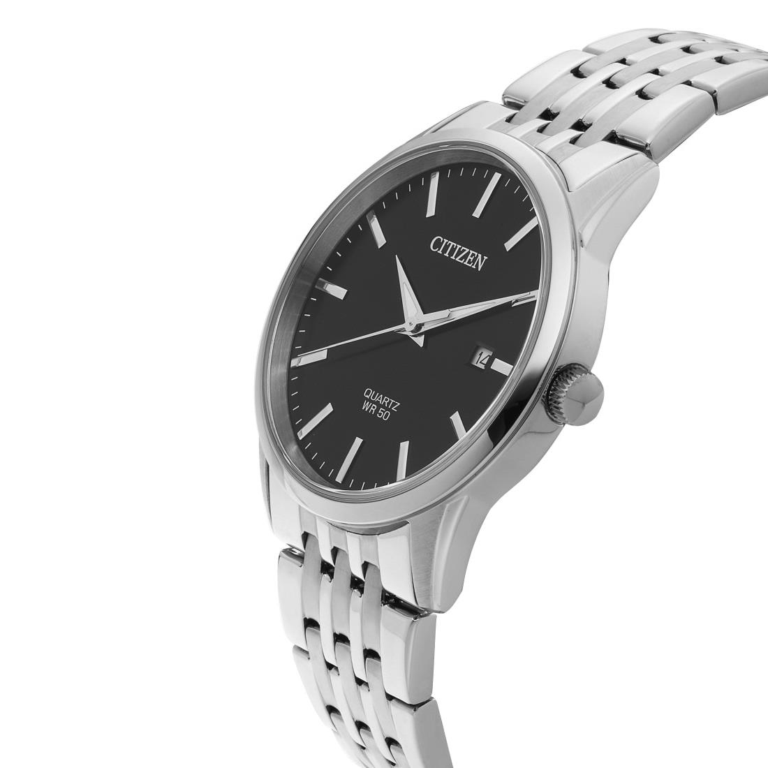 ساعت مچی مردانه سیتی زن CITIZEN با طراحی کلاسیک بند استیل و قاب گرد استیل و صفحه گرد مشکی و موتور ژاپنی با انرژی باتری و قابلیت داشتن تقویم , شب نما و مقاومت در برابر اب تا عمق 50 متر به همراه دو سال گارانتی بین المللی