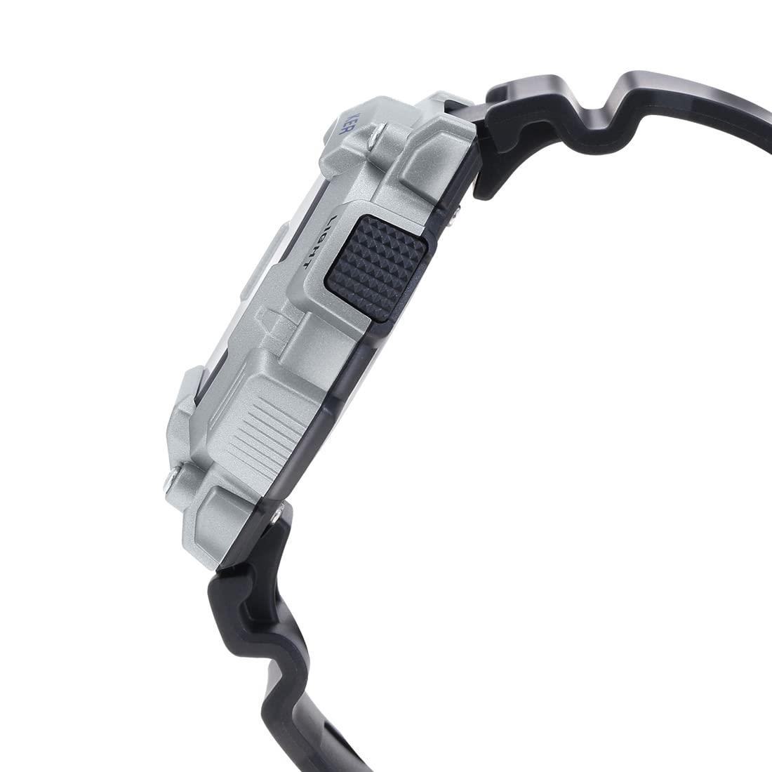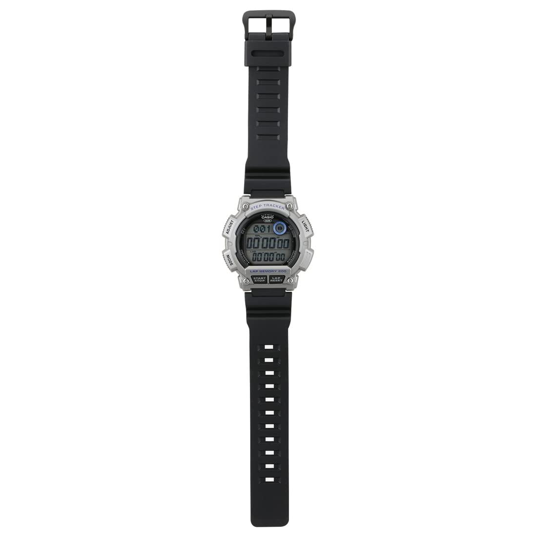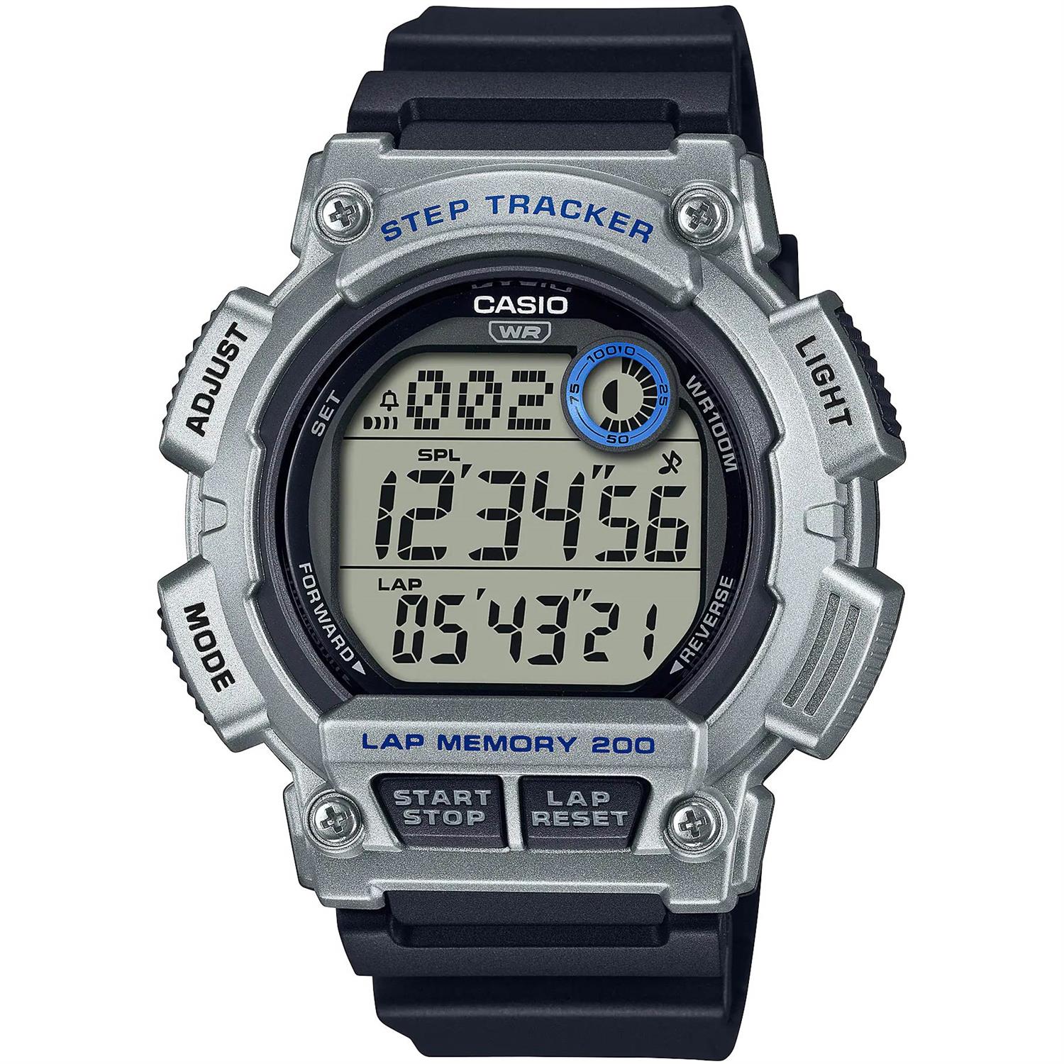 ساعت مچی مردانه کاسیو CASIO با طراحی اسپرت بند سیلیکونی مشکی و قاب گرد نقره ای و صفحه گرد طوسی با نمایشگر دیجیتال و قابلیت داشتن کرنوگراف , تقویم , نور پشت صفحه , زنگ هشدار, دوزمانه, تایمر شمارش معکوس,قدم شمار و موتور ژاپنی با انرژی باتری و مقاومت در برابر اب تا عمق 100 متر به همراه دو سال گارانتی بین المللی