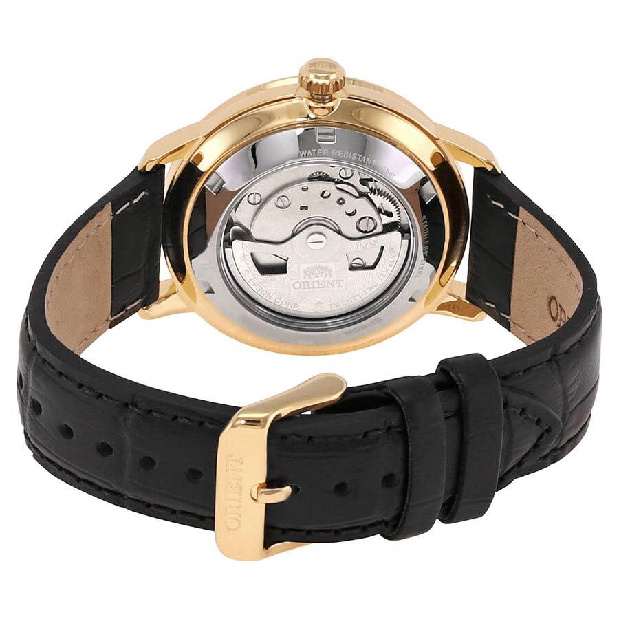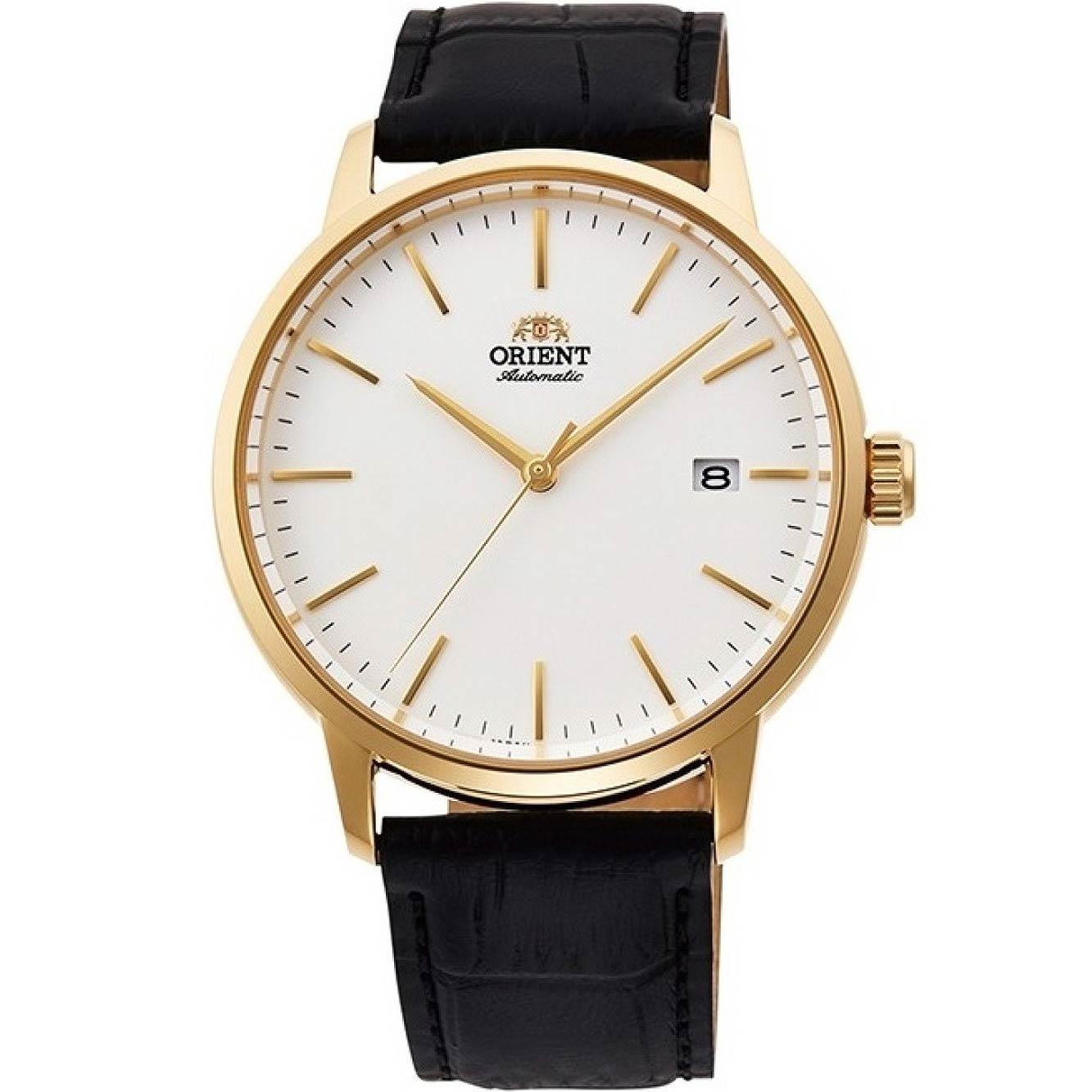 ساعت مچی مردانه اورینت ORIENT با طراحی کلاسیک بند چرمی و قاب گرد طلایی و صفحه گرد سفید با قابلیت داشتن تقویم و موتوراتوماتیک ژاپنی با انرژی مکانیکی و مقاومت در برابر اب تا عمق 100متر به همراه دو سال گارانتی بین المللی