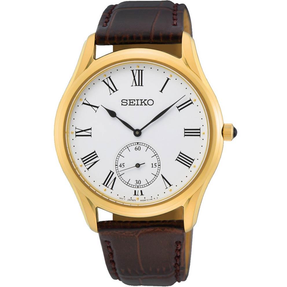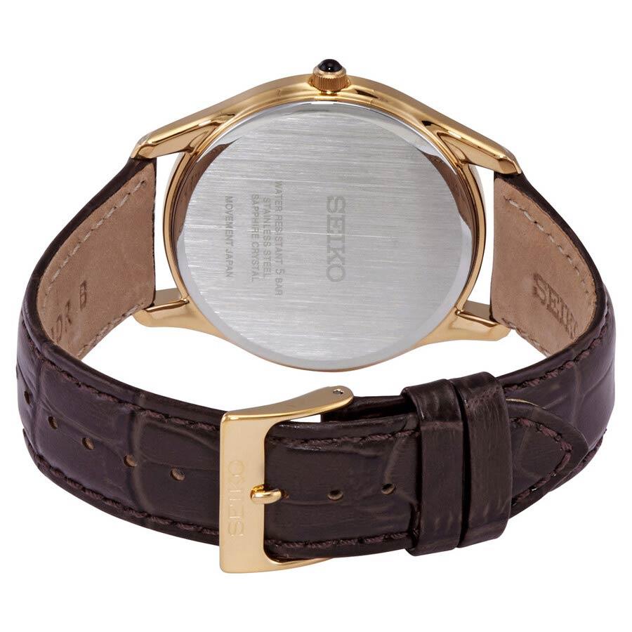 ساعت مچی مردانه سیکو SEIKO با طراحی کلاسیک بند چرمی با قاب گرد طلایی و صفحه گرد نقره ای با شیشه ضد خراش و موتور ژاپنی با انرژی باتری و قابلیت داشتن زیر ثانیه و مقاومت در برابر آب تا عمق 50 متر به همراه دو سال گارانتی بین المللی