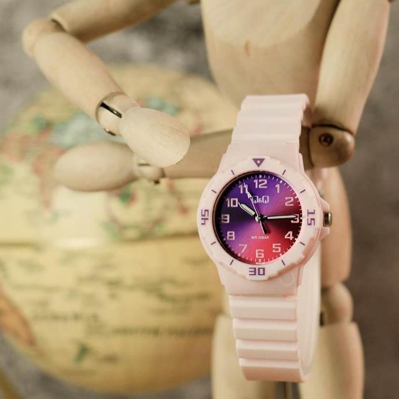 ساعت مچی زنانه کیو اند کیو QQ با طراحی روزانه بند سیلیکونی صورتی و قاب گرد صورتی و صفحه گرد ارغوانی با قابلیت داشتن شب نما و موتور ژاپنی با انرژی باطری و مقاوم در برابر آب تا عمق 100 متر به همراه یک سال گارانتی شرکتی