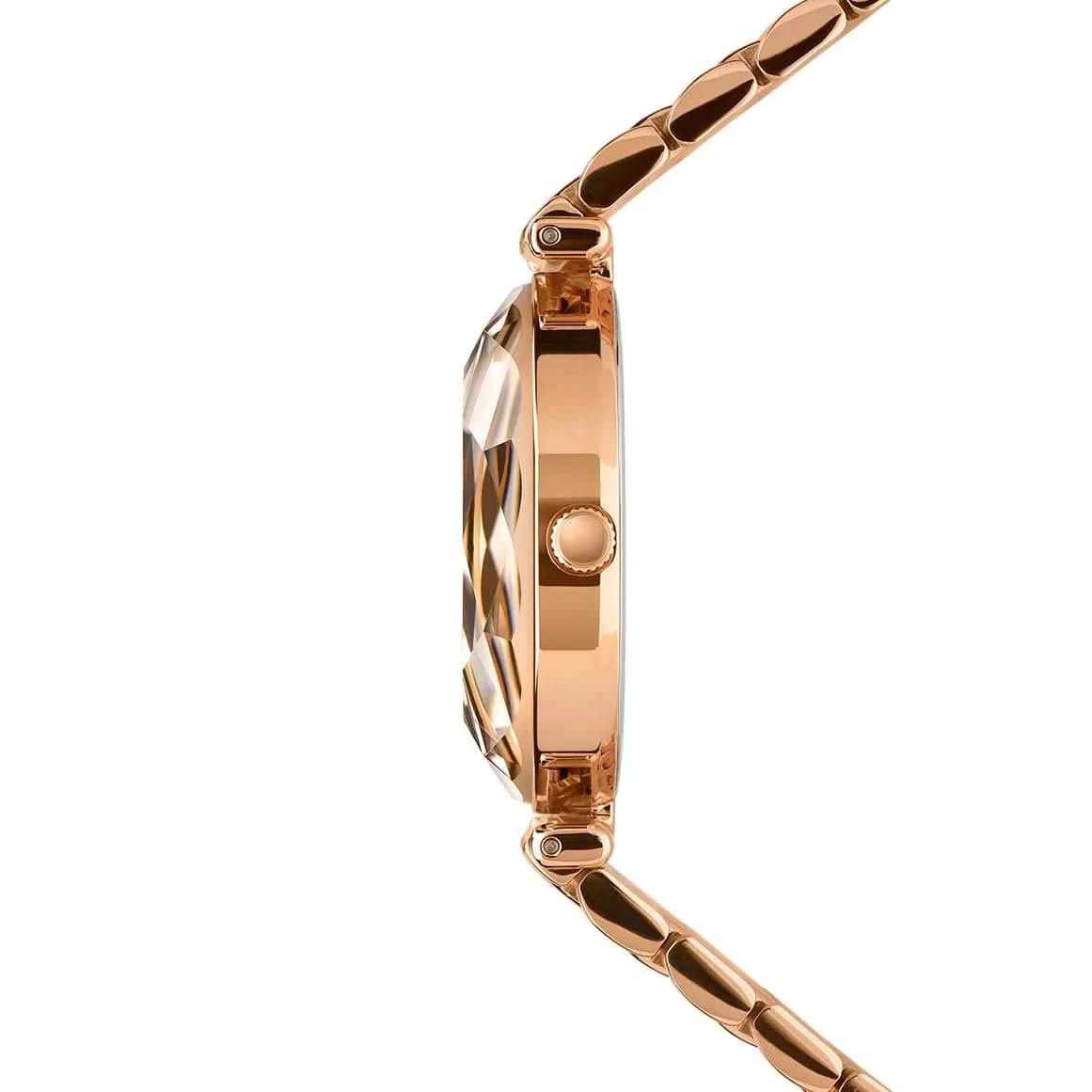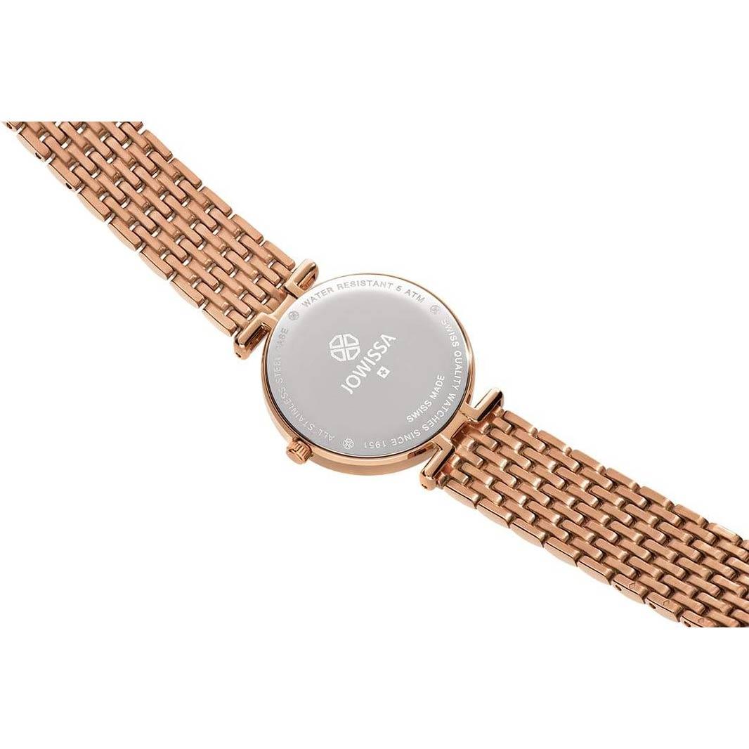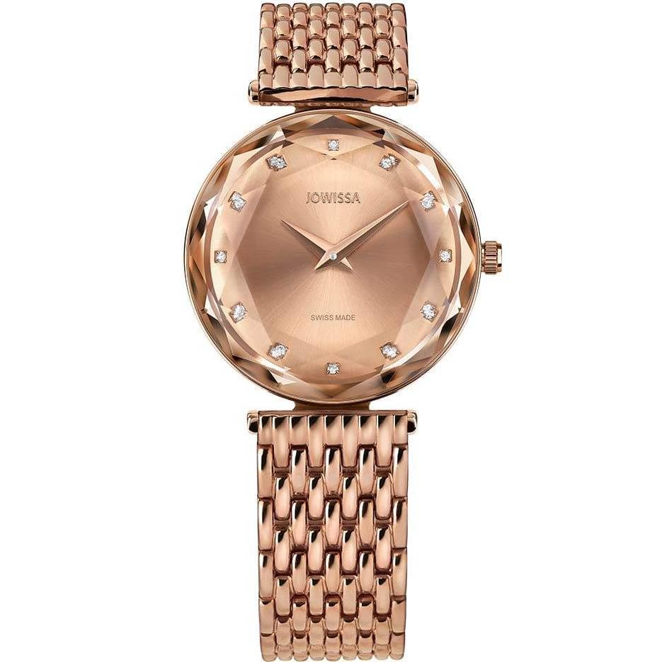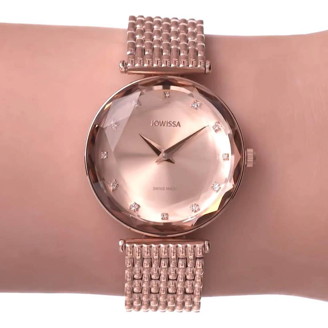 ساعت مچی زنانه جویسا JOWISSA با طراحی روزانه بند رزگلد با قاب گرد و صفحه مسی مزین به نگین با شیشه تراش خورده و موتور سوییسی با انرژی باطری و مقاوم در برابر آب تا عمق 50 متر به همراه دو سال گارانتی بین المللی
