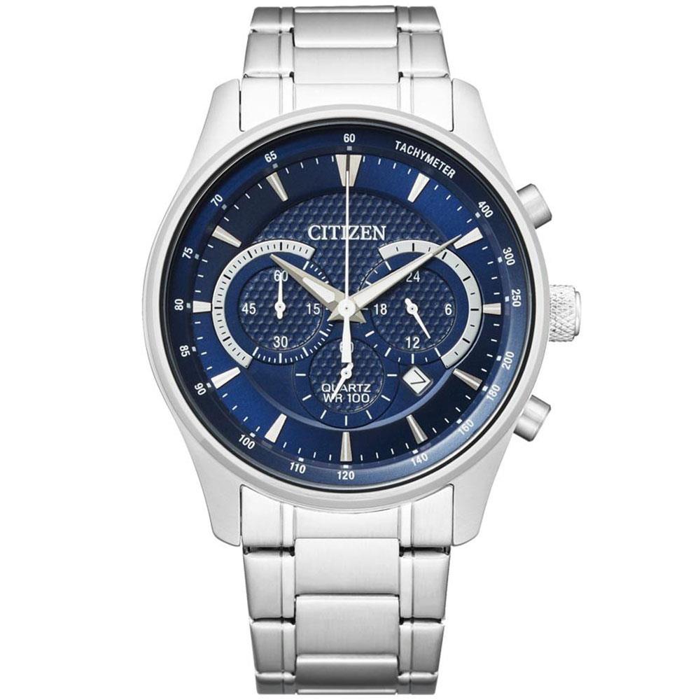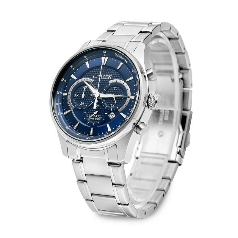 ساعت مچی مردانه سیتی زن CITIZEN با طراحی اسپرت بند استیل با قاب گرد استیل و صفحه سرمه ای و موتور ژاپنی با انرژی باتری و قابلیت داشتن تقویم شب نما کرنوگراف زه تاچی متر روز و شب و مقاوم در برابر آب تا عمق 100 متر به همراه دو سال گارانتی بین المللی