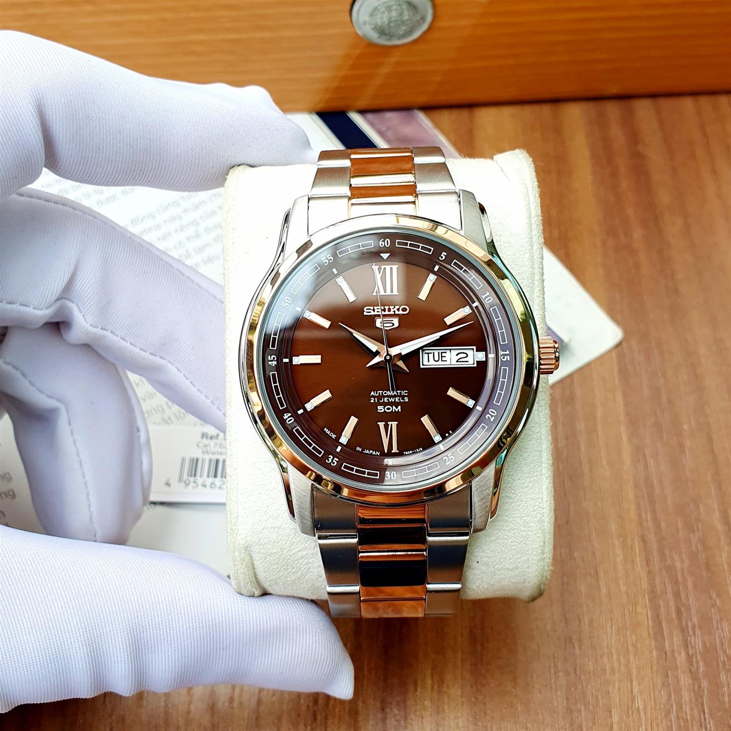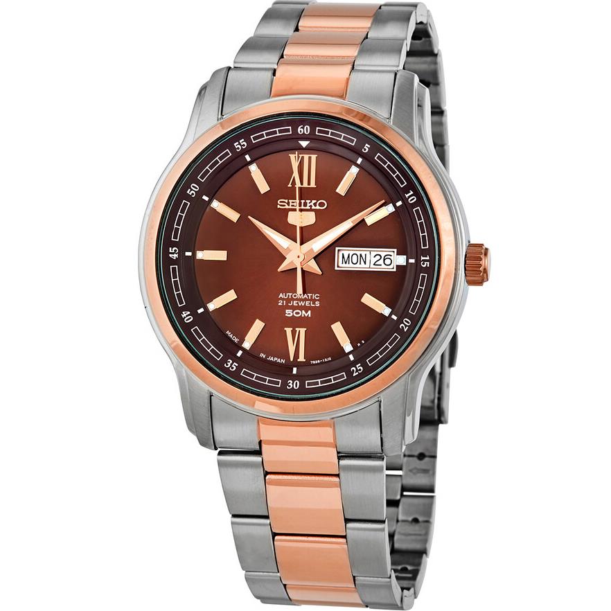 ساعت مچی مردانه سیکو SEIKO با طراحی روزانه بند دو رنگ با قاب گرد استیل رزگلد و صفحه گرد قهوه ای با موتور اتوماتیک ژاپنی با انرژی مکانیکی و قابلیت داشتن تقویم,شب نما روزهای هفته و مقاومت در برابر آب تا عمق 50 متر به همراه دو سال گارانتی بین المللی