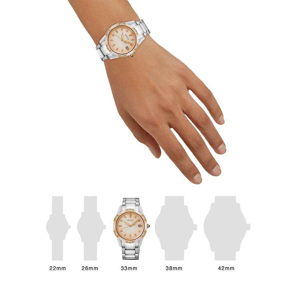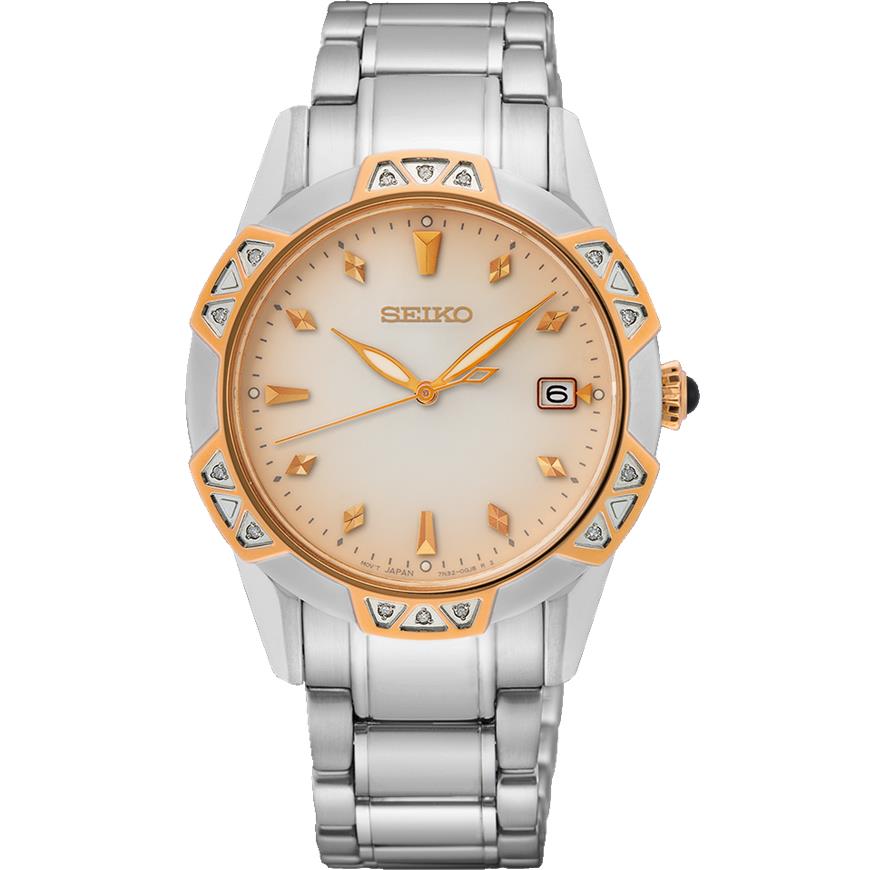 ساعت مچی زنانه سیکو seiko با طراحی کلاسیک بند استیل و قاب گرد نگین دار دو رنگ و صفحه دو رنگ با شیشه ضد خراش و قابلیت داشتن تقویم شب نما و موتور ژاپنی با انرژی باتری و مقاومت در برابر اب تا عمق 100 متر به همراه دو سال گارانتی بین المللی