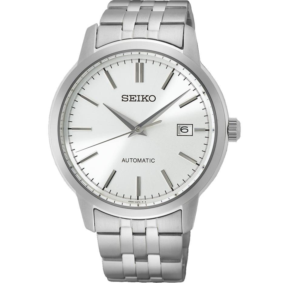 ساعت مچی مردانه سیکو seiko با طراحی کلاسیک بند استیل و قاب گرد استیل و صفحه نقره ای و قابلیت داشتن تقویم و موتور اتوماتیک ژاپنی با انرژی مکانیکی و مقاومت در برابر اب تا عمق 100 متر به همراه دو سال گارانتی بین المللی