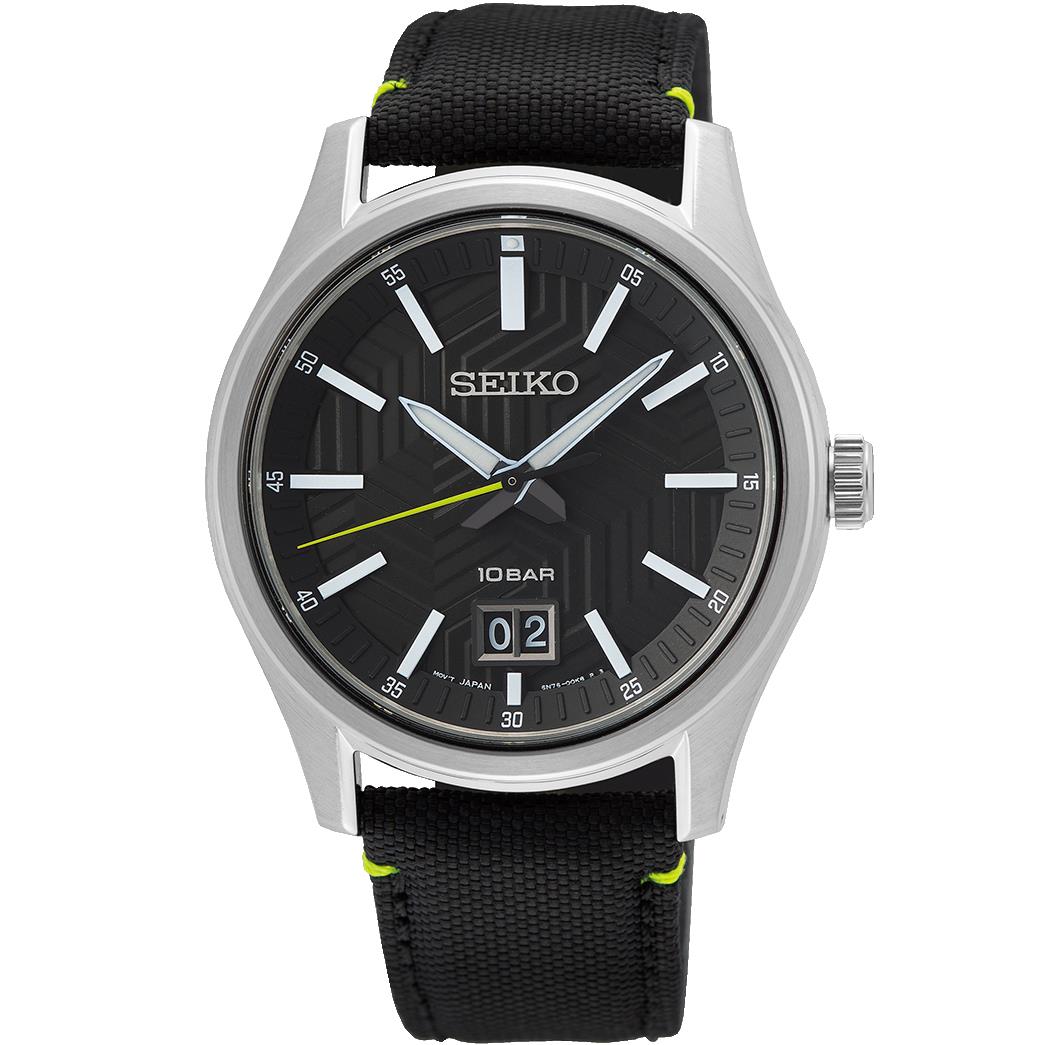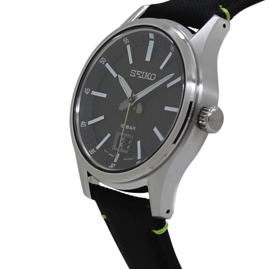 ساعت مچی مردانه سیکو seiko با طراحی اسپرت بند برزنتی مشکی و قاب گرد و صفحه مشکی با شیشه ضد خراش و قابلیت داشتن تقویم ,شب نما و موتور ژاپنی با انرژی باتری و مقاومت در برابر اب تا عمق 100 متر به همراه دو سال گارانتی بین المللی