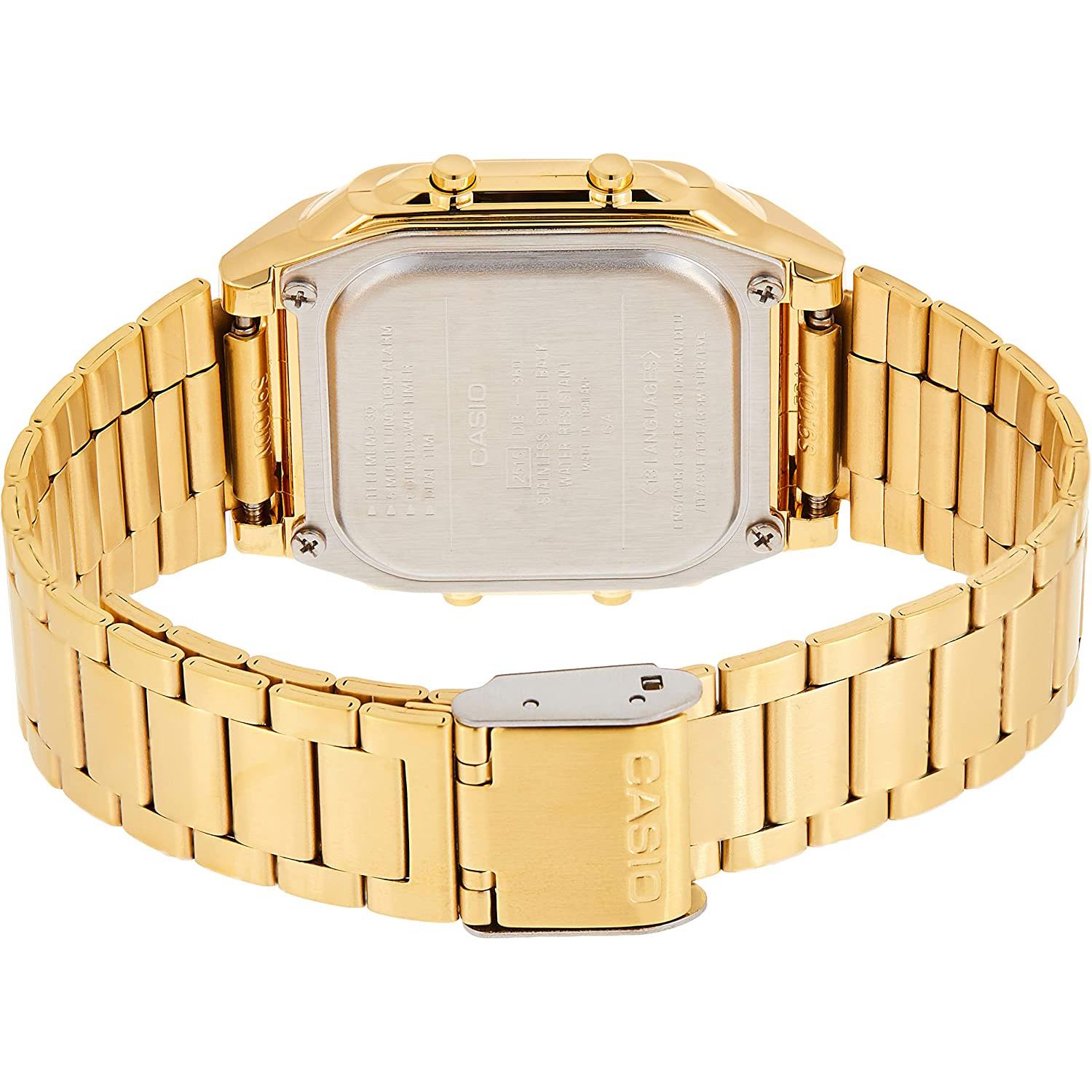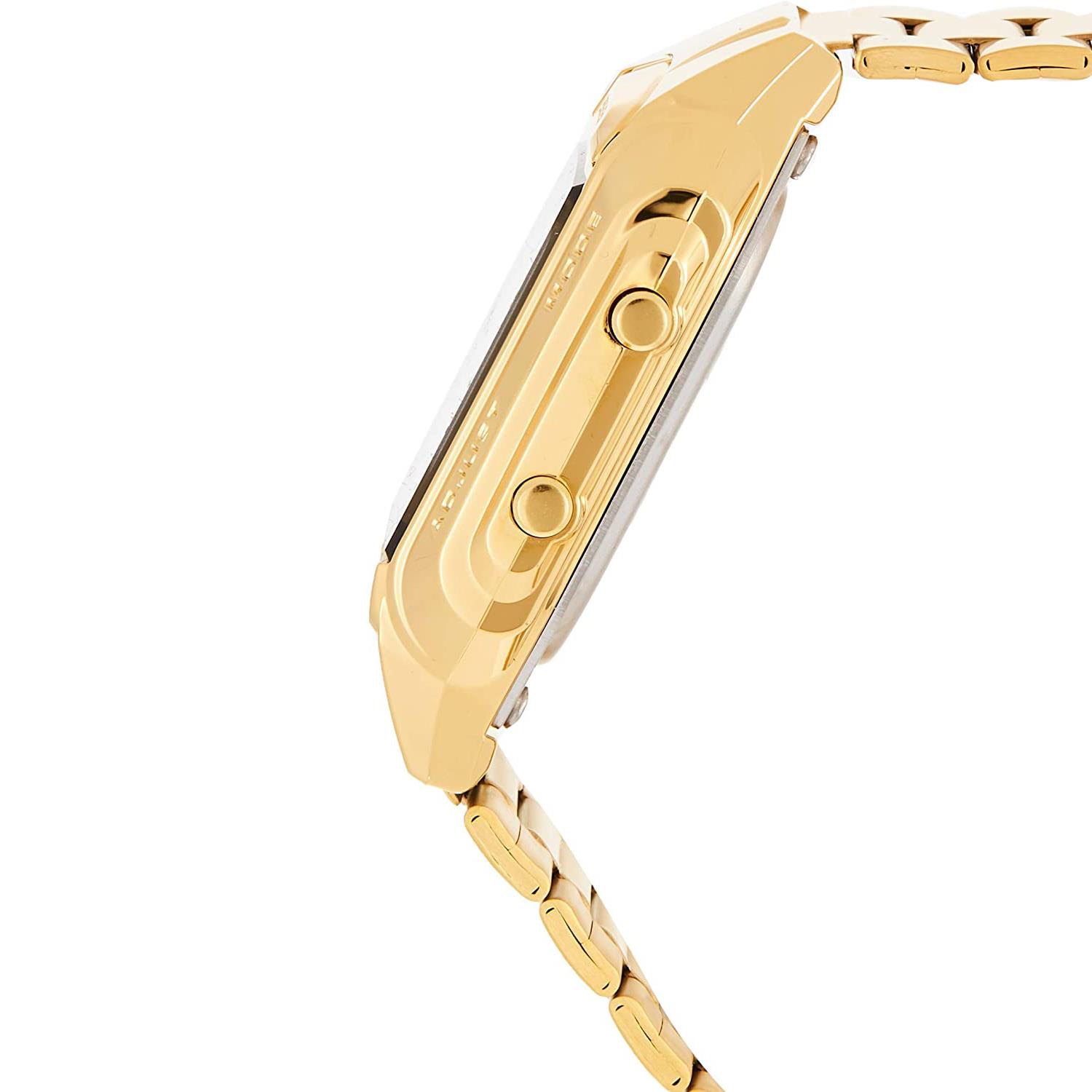 ساعت مچی مردانه کاسیو casio با طراحی روزانه و بند فلزی طلایی و قاب مربع و صفحه مشکی طوسی با نمایشگر دیجیتال و موتور ژاپنی 10 سال باتری و قابلیت کرنوگراف , روزهای هفته , تقویم, روز و شب , زنگ هشدار , نور پشت صفحه تایمر شمارش معکوس دو زمانه و مقاومت در برابر اب تا عمق 30 متر به همراه دو سال گارانتی بین المللی