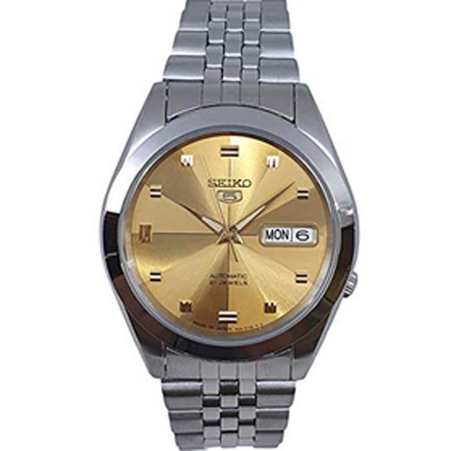 ساعت مچی مردانه سیکو seiko با طراحی روزانه بند استیل و قاب گرد و صفحه طلایی با قابلیت داشتن تقویم ,شب نما , روزهای هفته و موتور اتوماتیک ژاپنی با انرژی مکانیکی و مقاومت در برابر اب تا عمق 30 متر به همراه دو سال گارانتی بین المللی