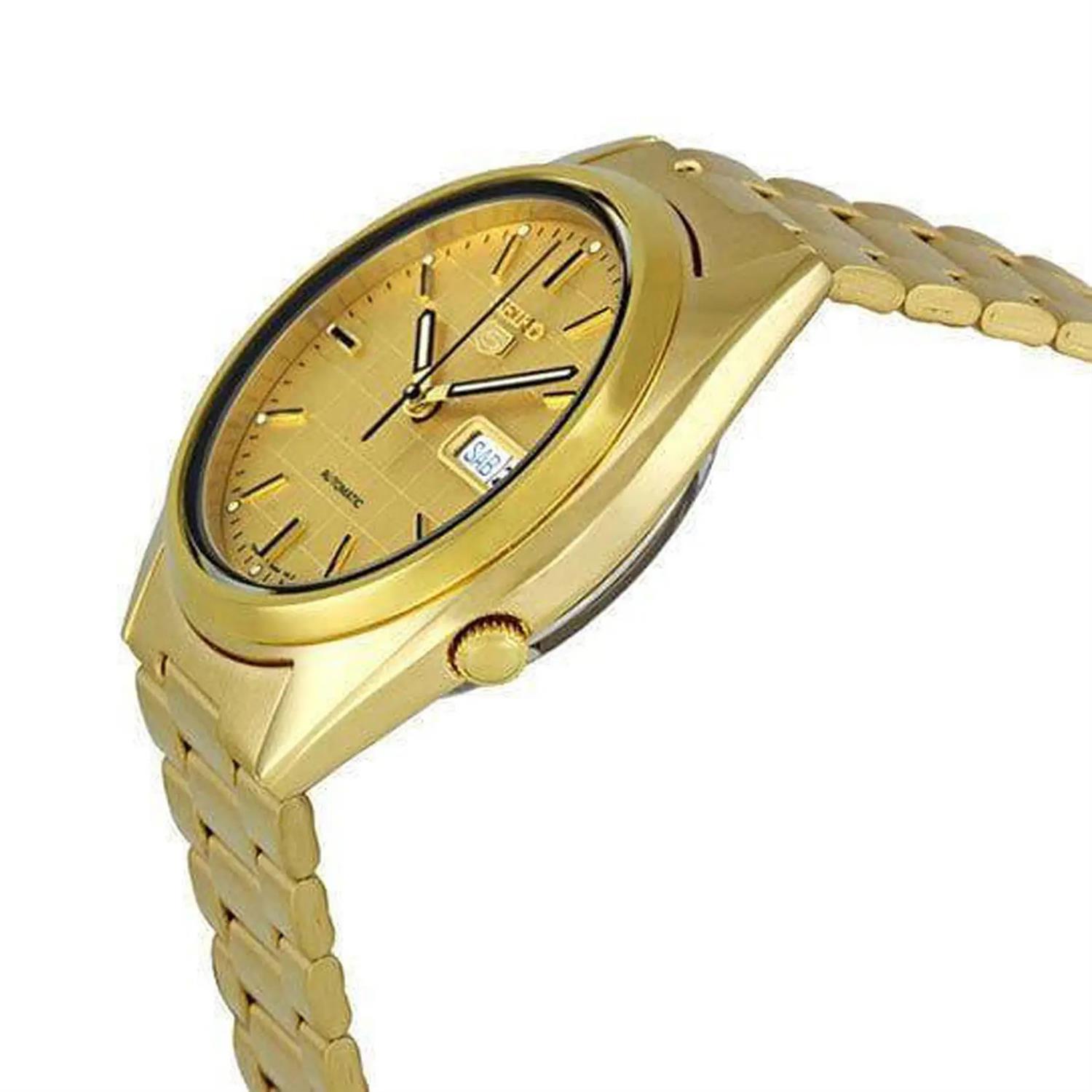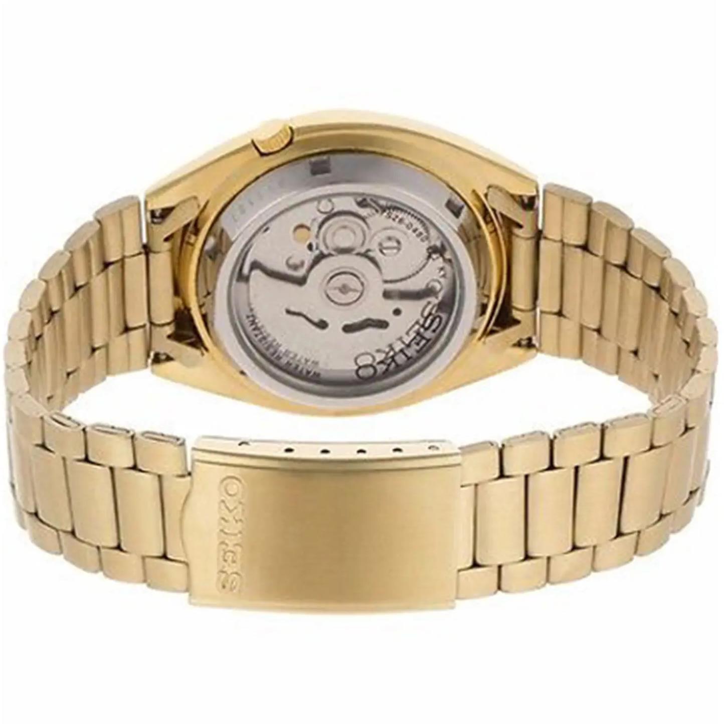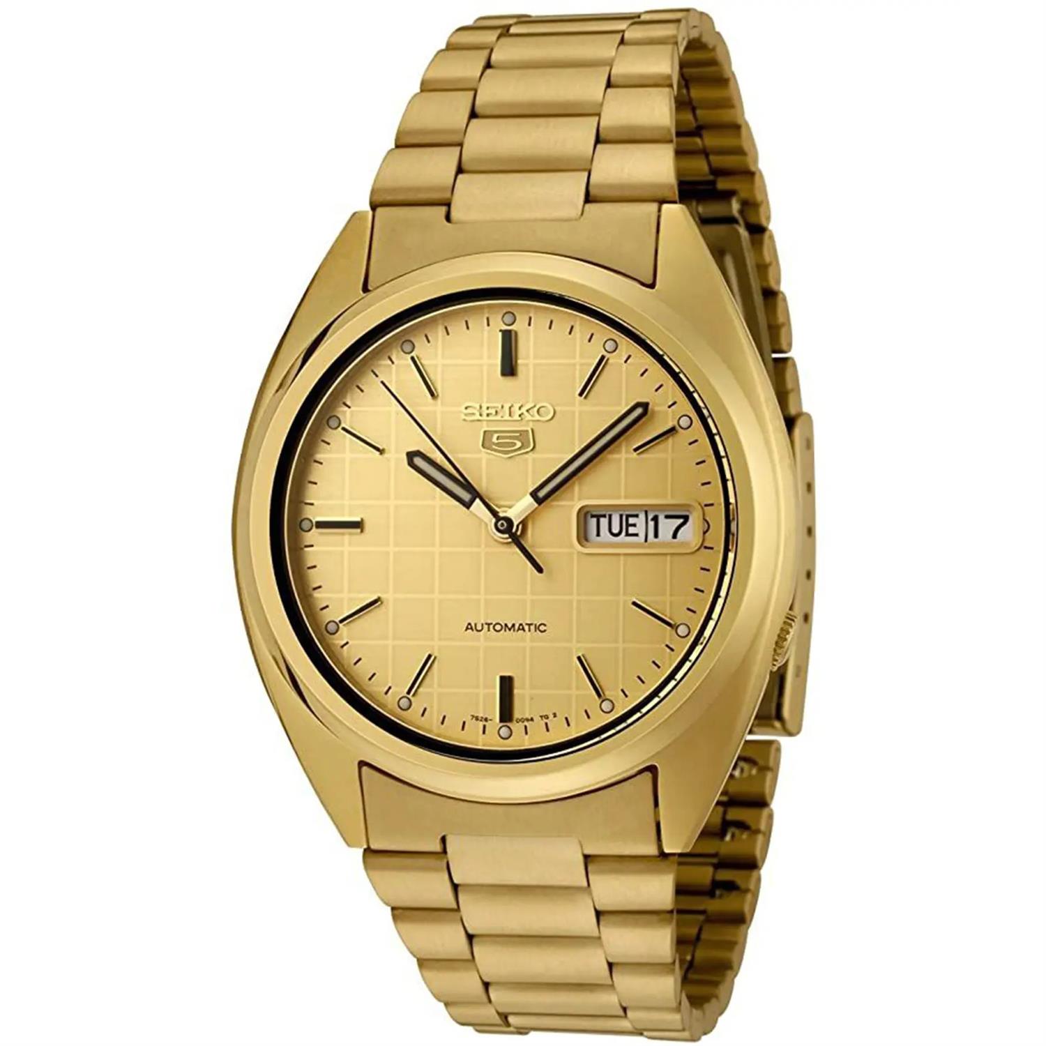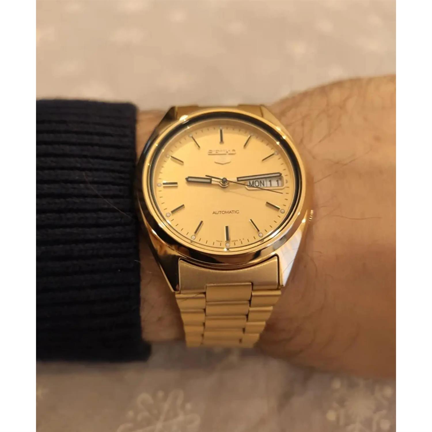 ساعت مچی مردانه سیکو seiko با طراحی روزانه بند فلزی طلایی و قاب گرد و صفحه طلایی با قابلیت داشتن تقویم ,شب نما , روزهای هفته و موتور اتوماتیک ژاپنی با انرژی مکانیکی و مقاومت در برابر اب تا عمق 30 متر به همراه دو سال گارانتی بین المللی