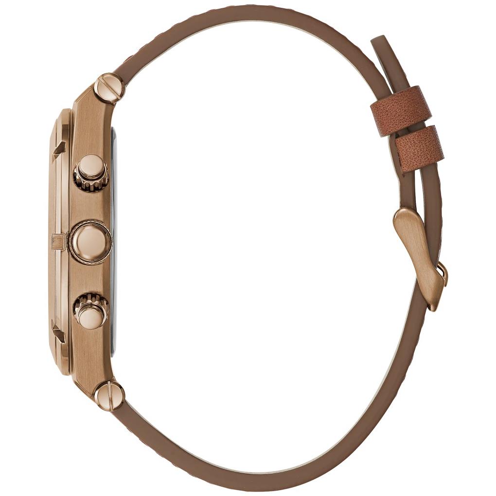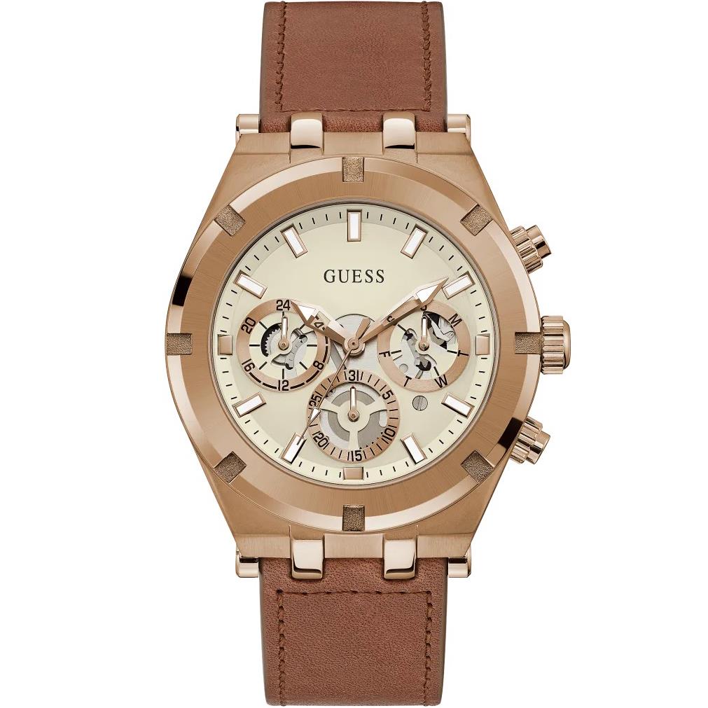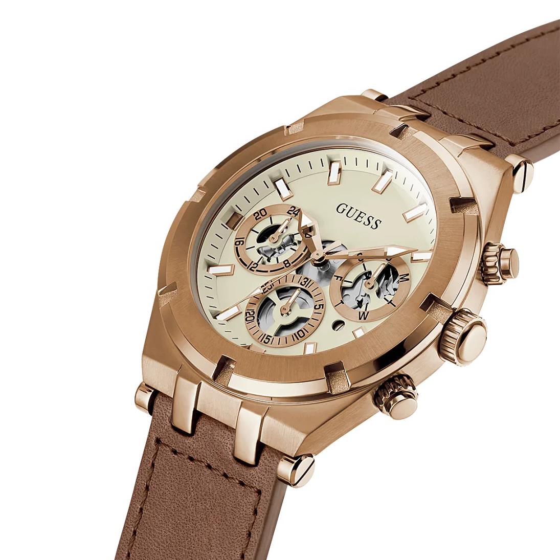 ساعت مچی مردانه گس guess با طراحی اسپرت بند چرمی و قاب گرد مسی و صفحه کرم با قابلیت داشتن روز و شب ,تقویم ,روزهای هفته , شبنما موتور ژاپنی و انرژی باتری و مقاومت در برابر آب تا عمق 50 متر به همراه دو سال گارانتی بین المللی