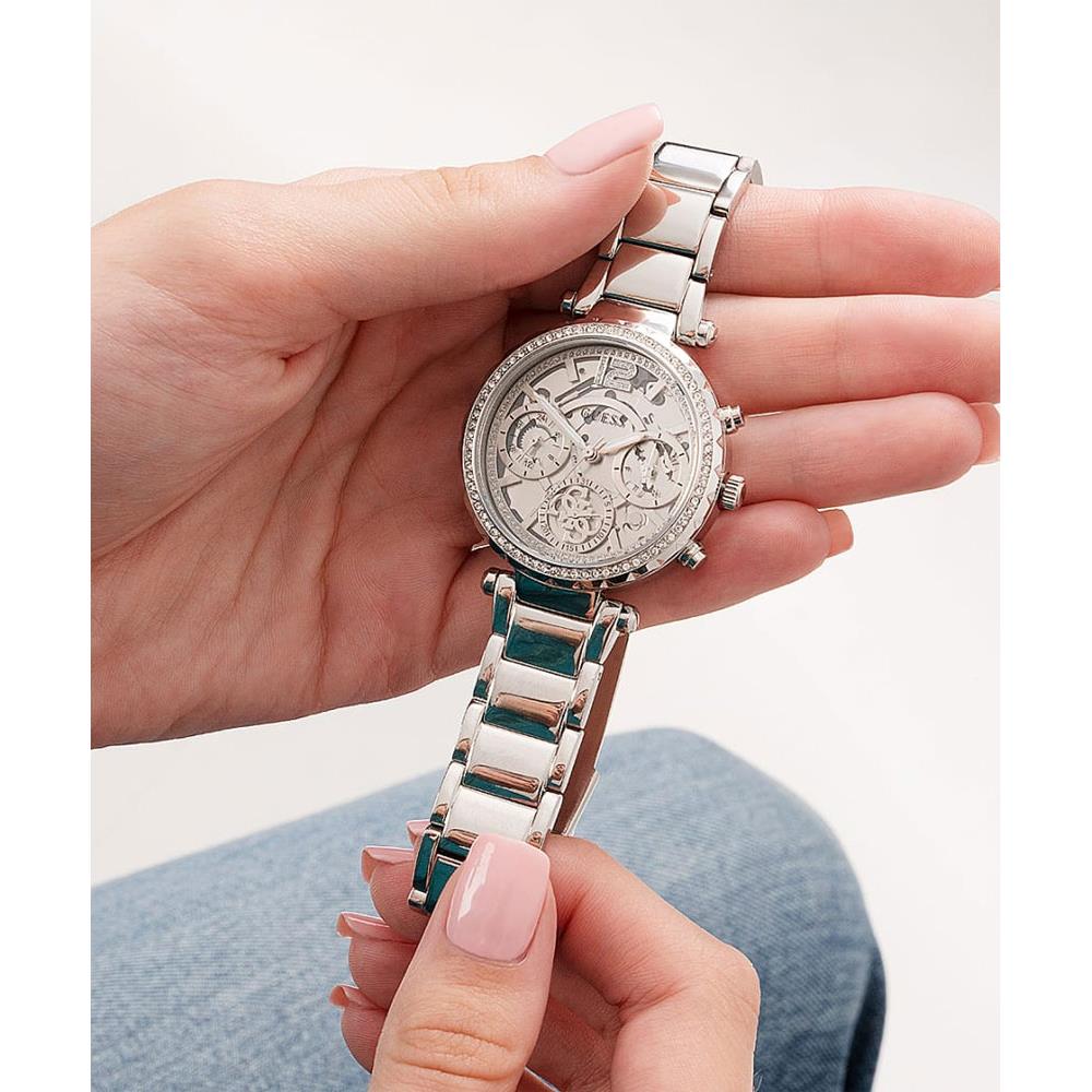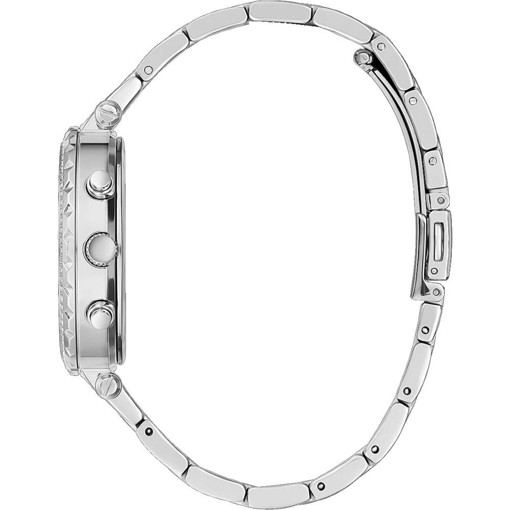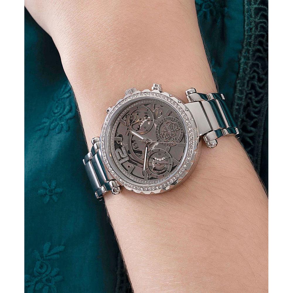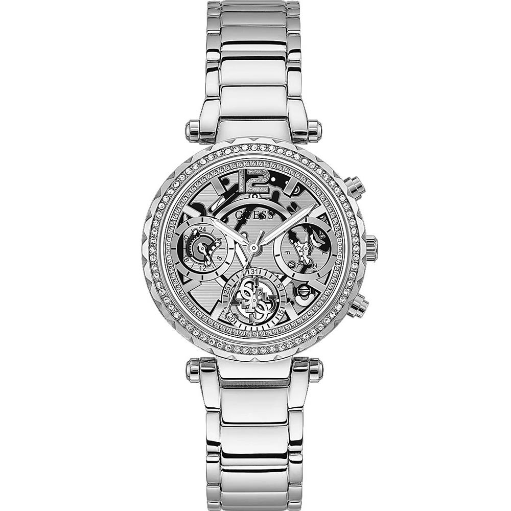 ساعت مچی زنانه گس GUESS با طراحی اسپرت بند استیل و قاب گرد نگین دار و صفحه نگین دار نقره ای با قابلیت داشتن صفحه اسکلتون ,تقویم ,روز و شب ,روزهای هفته, شب نما موتور ژاپنی با انرژی باتری و مقاومت در برابراب تا عمق 30 متربه همراه دو سال گارانتی بین المللی