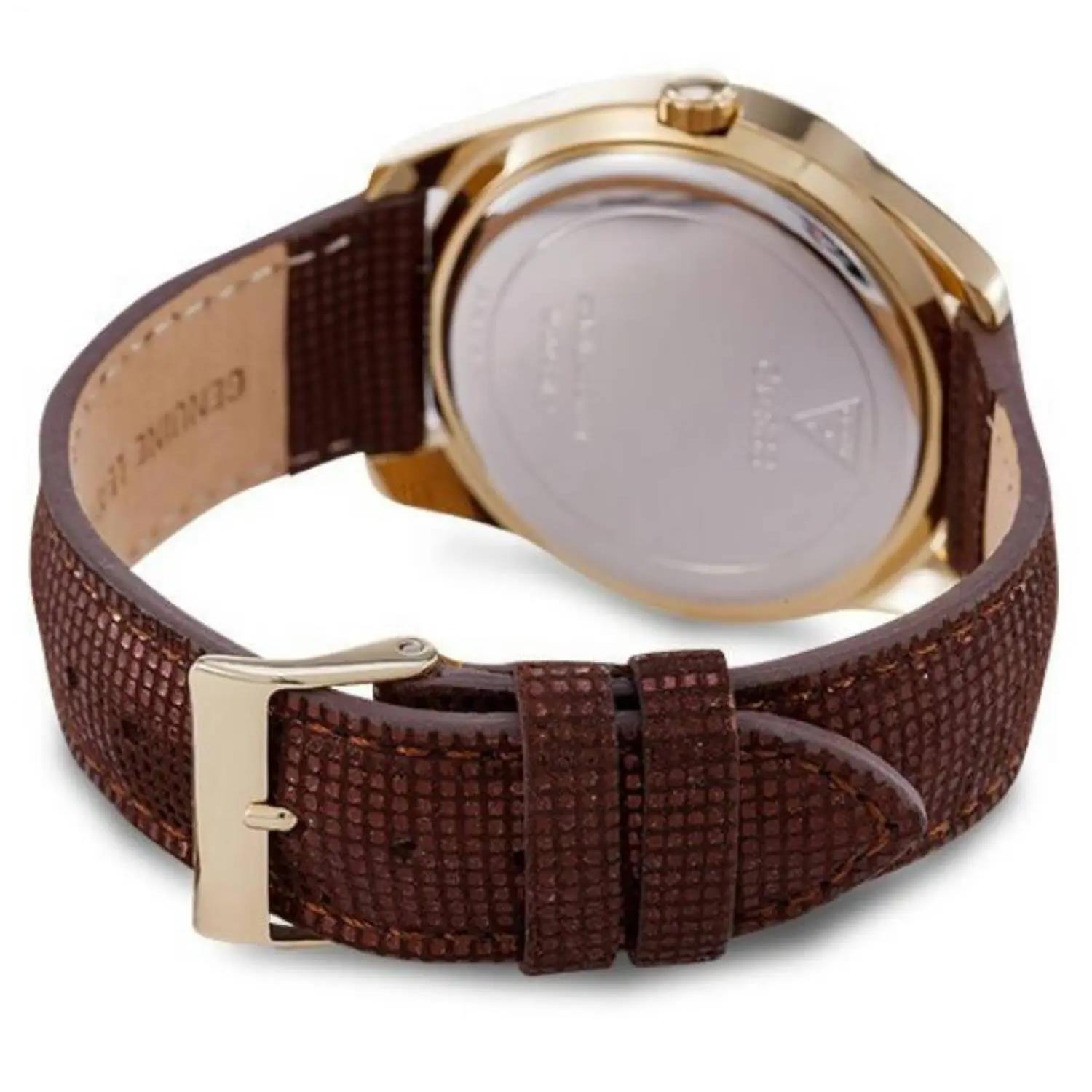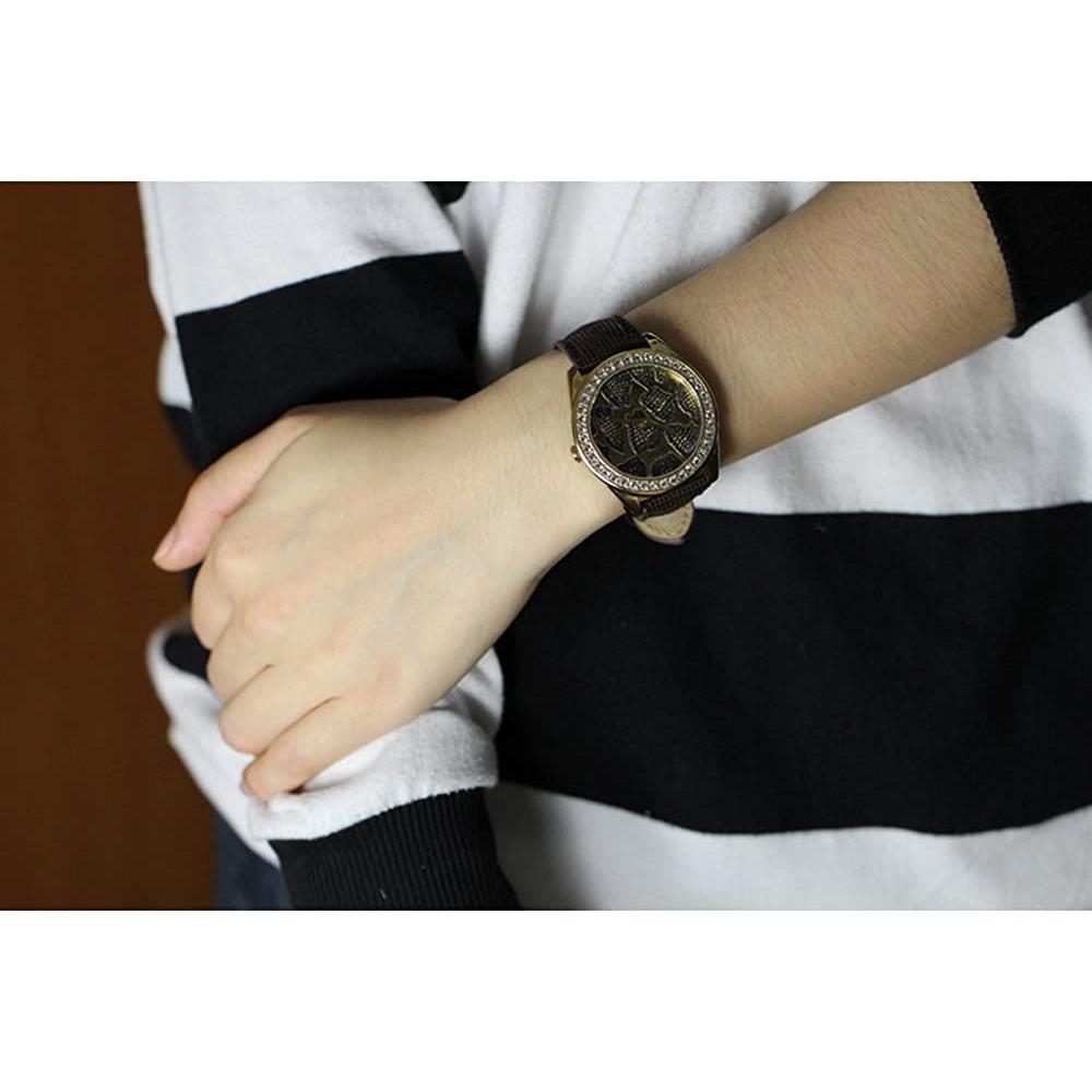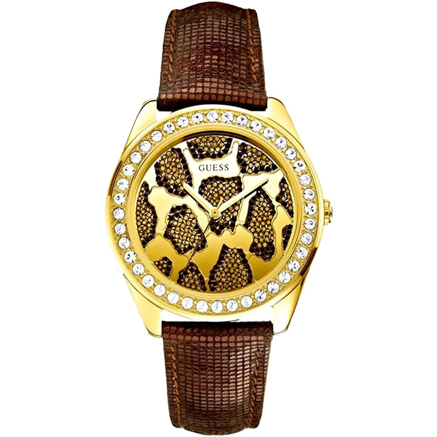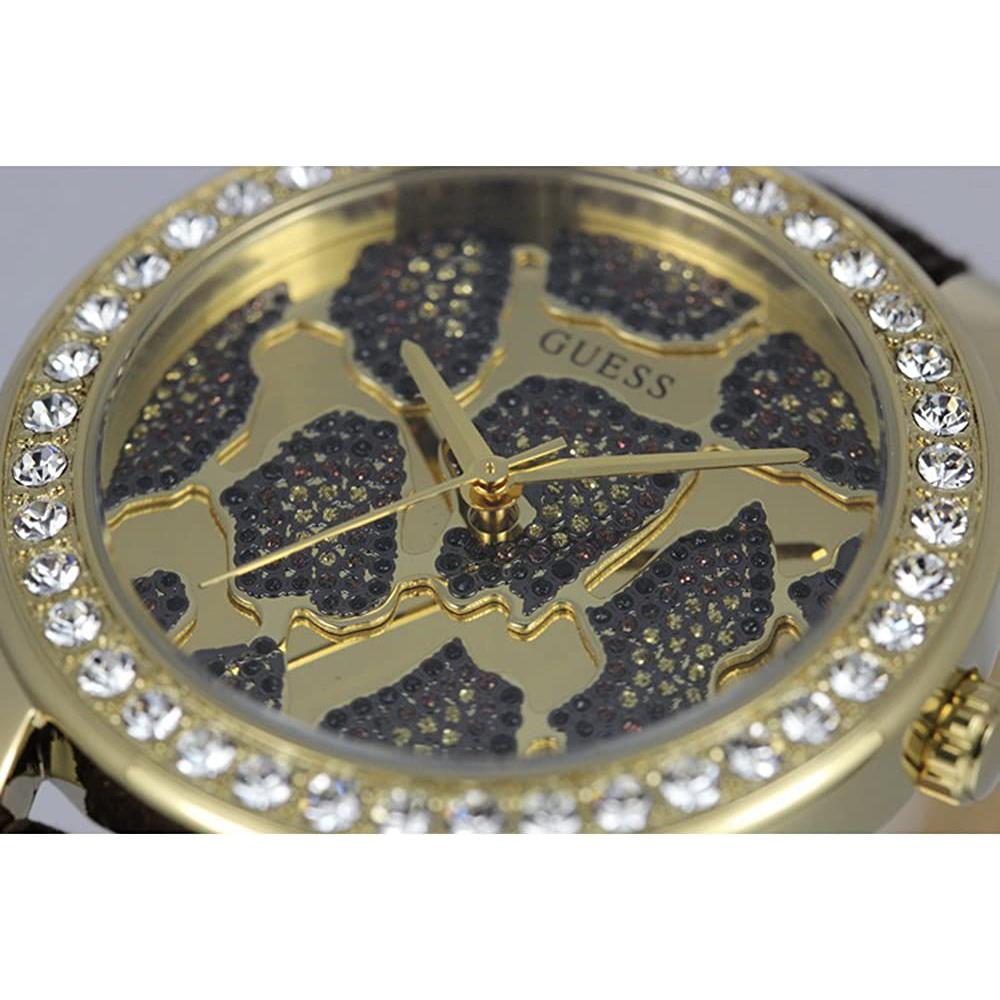 ساعت مچی زنانه با طراحی روزانه بند چرمی و قاب گرد دور نگین طلایی و صفحه دو رنگ و موتور ژاپنی با انرژی باتری و مقاومت در برابر اب تا عمق 30 متر به همراه دو سال گارانتی بین المللی