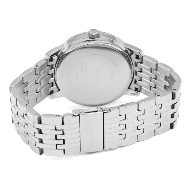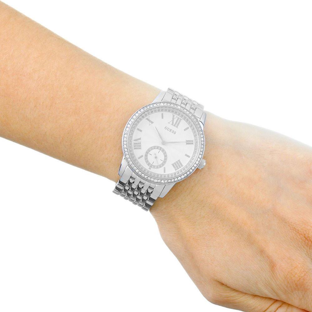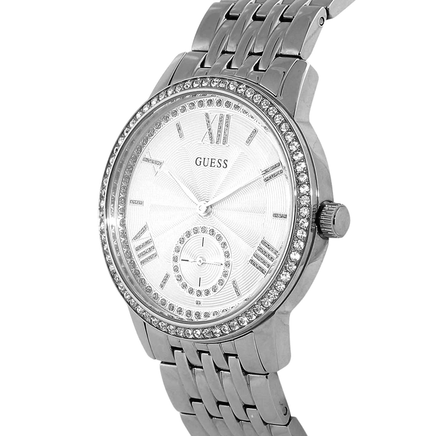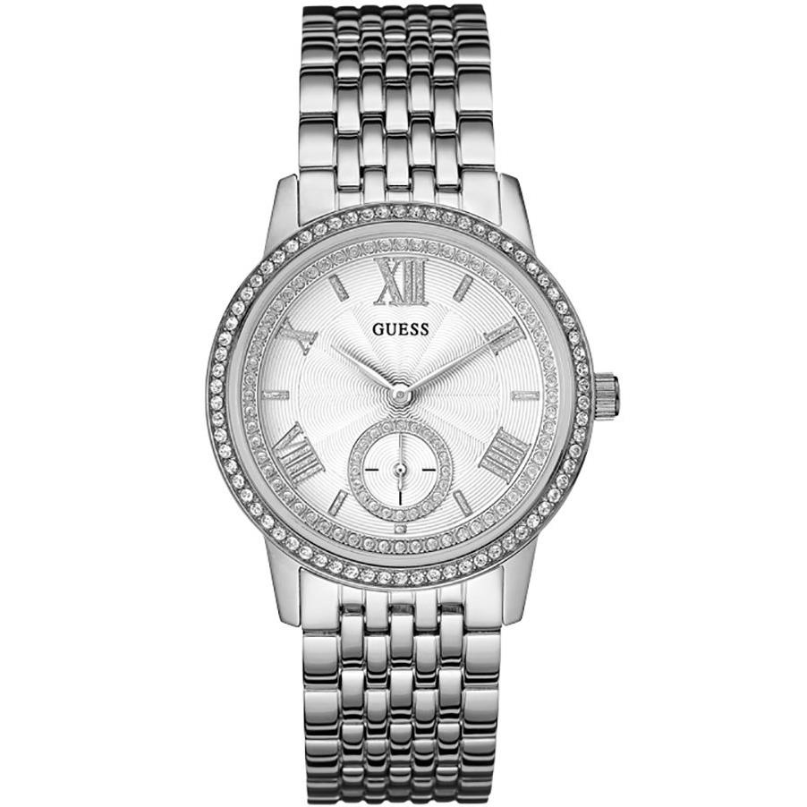 ساعت مچی زنانه با طراحی روزانه بند استیل و قاب گرد دور نگین دار و صفحه نقره ای نگین دار با قابلیت داشتن زیر ثانیه و موتور ژاپنی با انرژی باتری و مقاومت در برابر آب تا عمق 30 متر به همراه دو سال گارانتی بین المللی