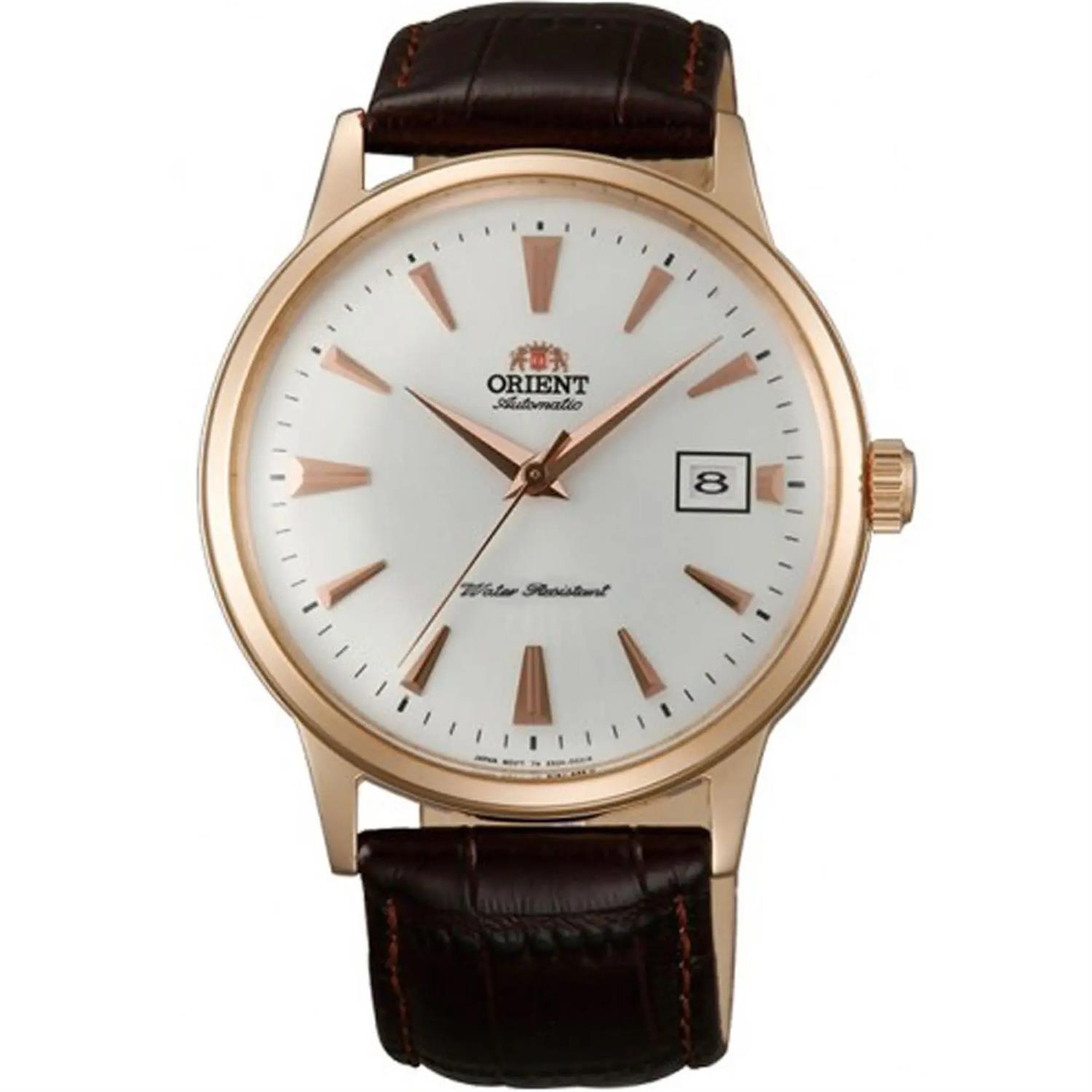 ساعت مچی مردانه اورینت ORIENT با طراحی کلاسیک بند چرمی و قاب گرد رزگلد و صفحه سفید با قابلیت داشتن تقویم و موتور اتوماتیک ژاپنی با انرژی مکانیکی و مقاومت در برابر اب تا عمق 30 متر به همراه دو سال گارانتی بین المللی