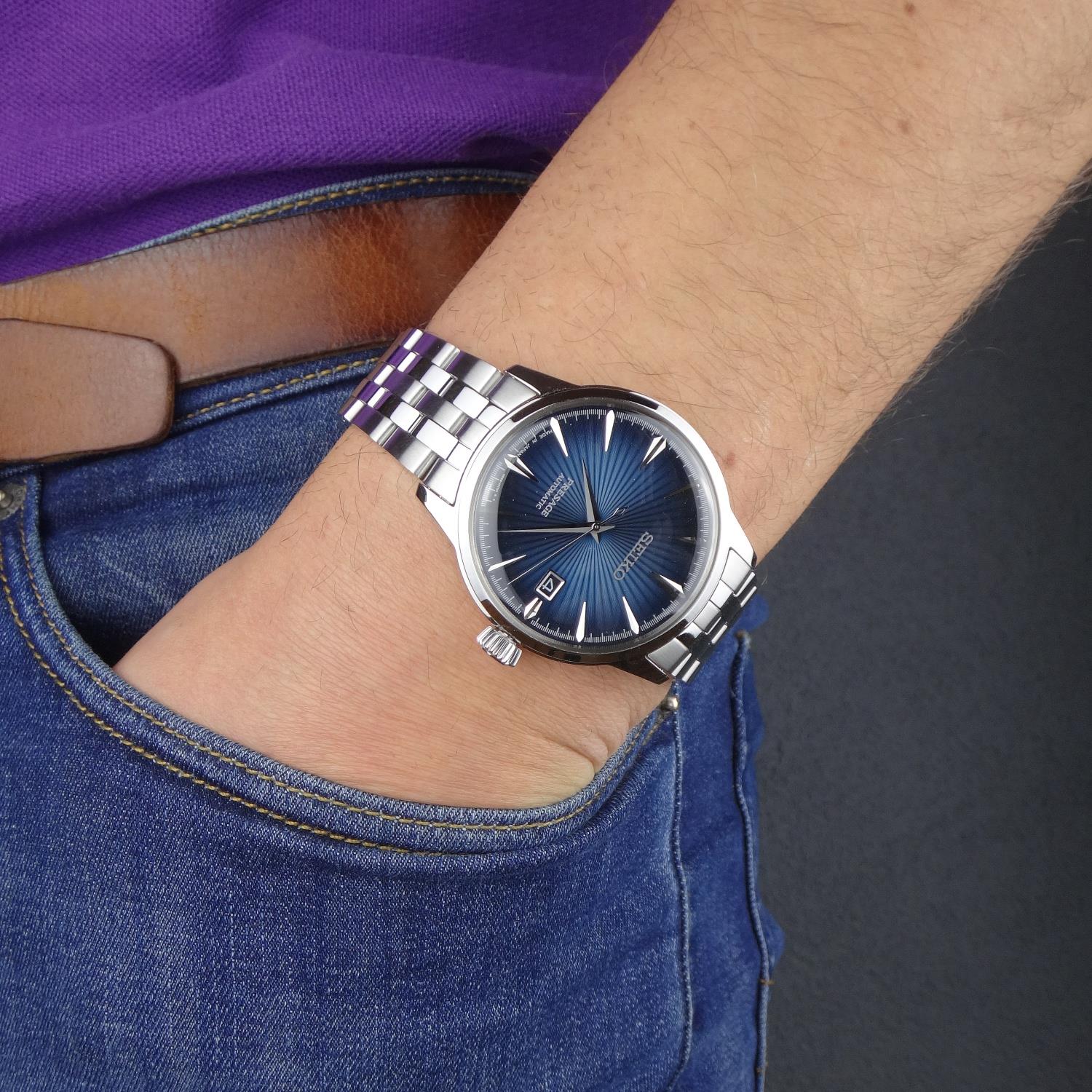 ساعت Seiko Presage Cocktail Time SRPB41J1 از برند ژاپنی معتبر Seiko جزو مجموعهی Presage Cocktail Time است — یک ساعت اتوماتیک کلاسیک با طراحی الهامگرفته از فرهنگ کوکتلها که زیبایی و مهندسی دقیق را کنار هم قرار میدهد. صفحهی آبی خورشیدی (Sun-Brushed) با بازتاب نور جذاب و قاب فولادی براق، این مدل را به انتخابی شکیل برای استفادهی روزمره، کاری و حتی موقعیتهای رسمی سبک تبدیل کرده است. موتور اتوماتیک با ذخیرهی انرژی مناسب، عملکردی بیدغدغه و قابلاعتماد ارائه میدهد.