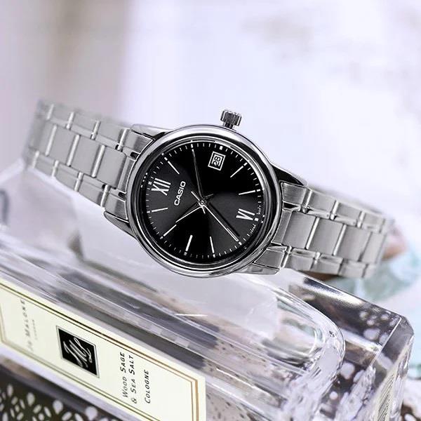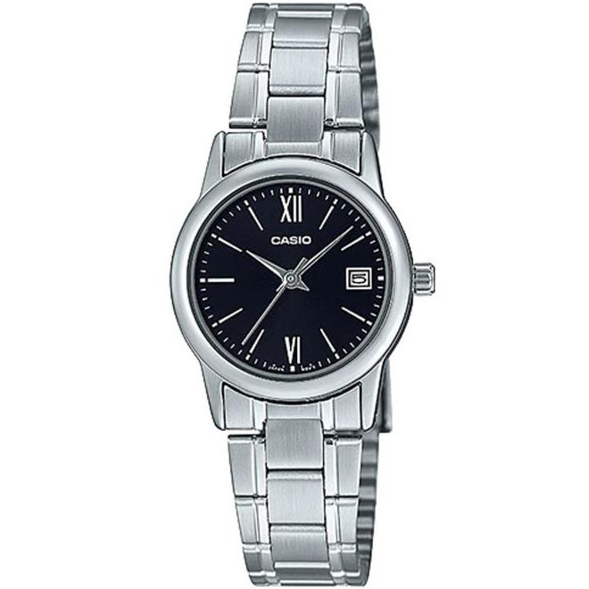 ساعت مچی زنانه کاسیو casio با طراحی روزانه بند استیل و قاب گرد استیل و صفحه مشکی با قابلیت داشتن تقویم  و موتور ژاپنی با انرژی باتری و مقاومت در برابر اب تا عمق 30 متر به همراه دو سال گارانتی بین المللی