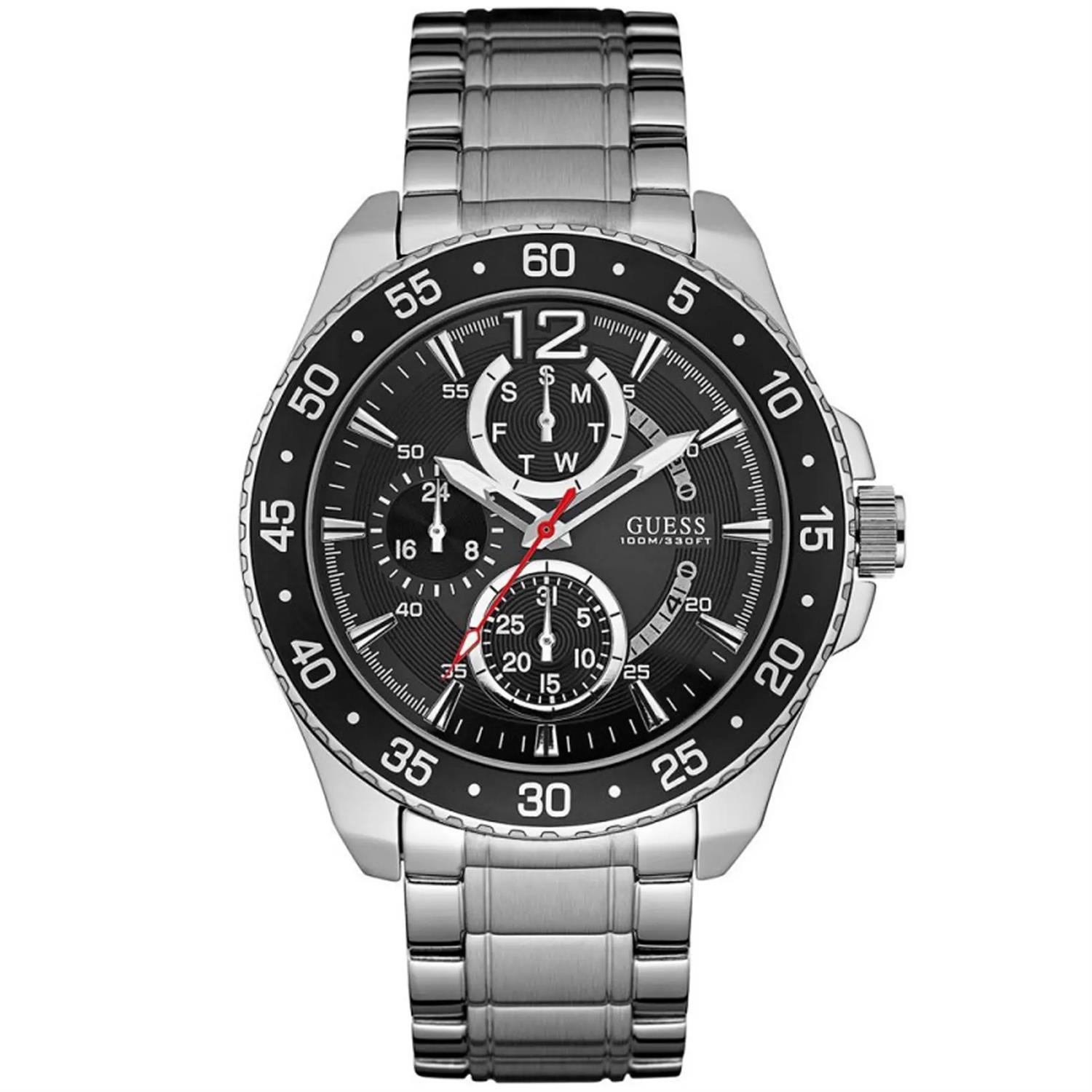 ساعت مچی مردانه گس GUESS با طراحی روزانه بند استیل و قاب استیل مشکی و صفحه مشکی با قابلیت داشتن تقویم ,روز و شب ,روزهای هفته ,شب نما ,زه چرخان موتور ژاپنی و انرژی باتری و مقاومت در برابر اب تا عمق 100متر به همراه دو سال گارانتی بین المللی