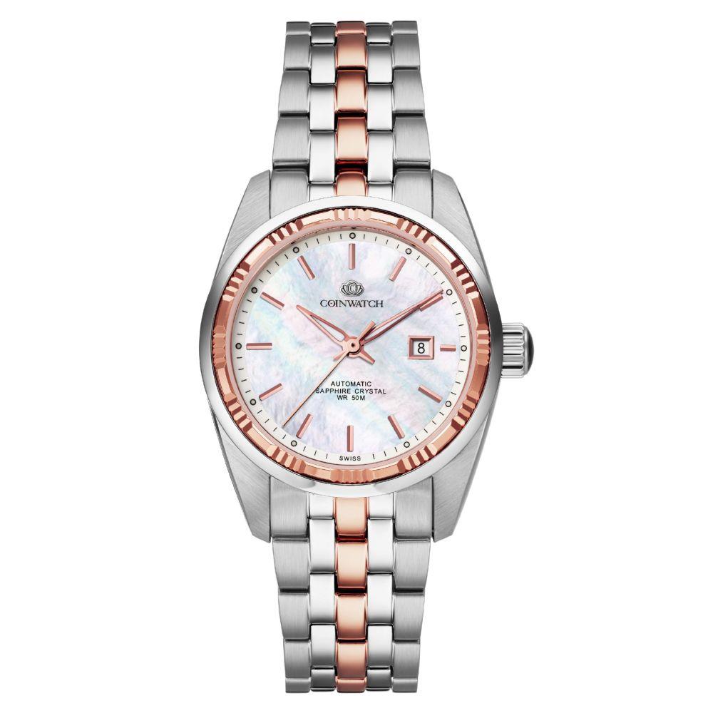 ساعت مچی زنانه کوین واچ COINWATCH با طراحی کلاسیک بند استیل مسی با قاب گرد دو رنگ و صفحه سفید صدفی با قابلیت داشتن تقویم, شب نما و شیشه ضد خراش با موتور اتوماتیک سوییسی و انرژی مکانیکی و مقاوم در برابر آب تا عمق 50 متر به همراه دو سال گارانتی بین المللی