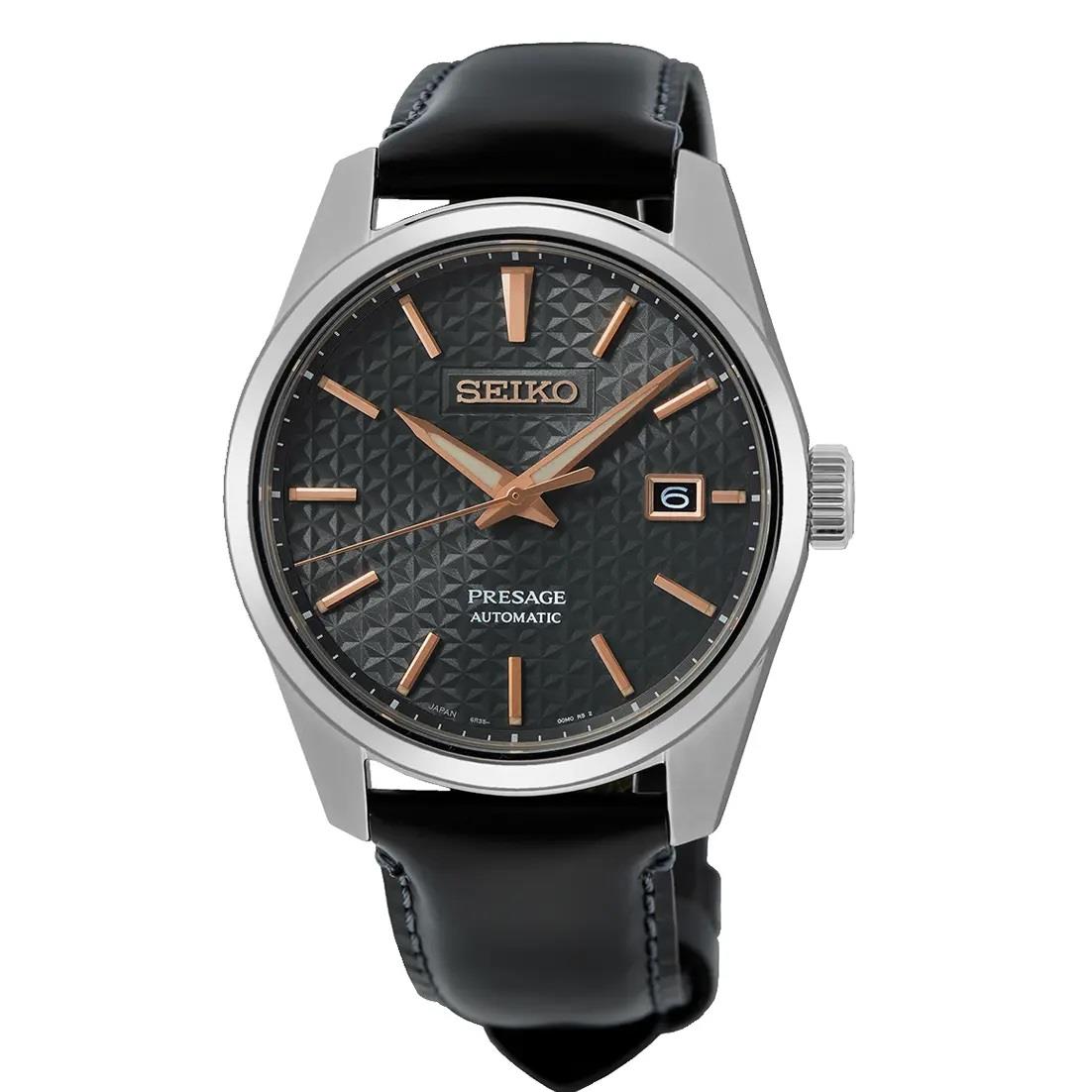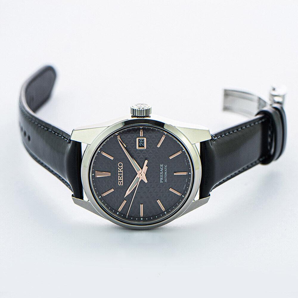 ساعت مچی مردانه سیکو seiko با طراحی روزانه بند چرمی و قاب گرد استیل و صفحه طوسی با قابلیت داشتن روز و شب, تقویم ,شب نما و موتور اتوماتیک ژاپنی با انرژی مکانیکی و مقاومت در برابر اب تا عمق 100 متر به همراه دو سال گارانتی بین المللی