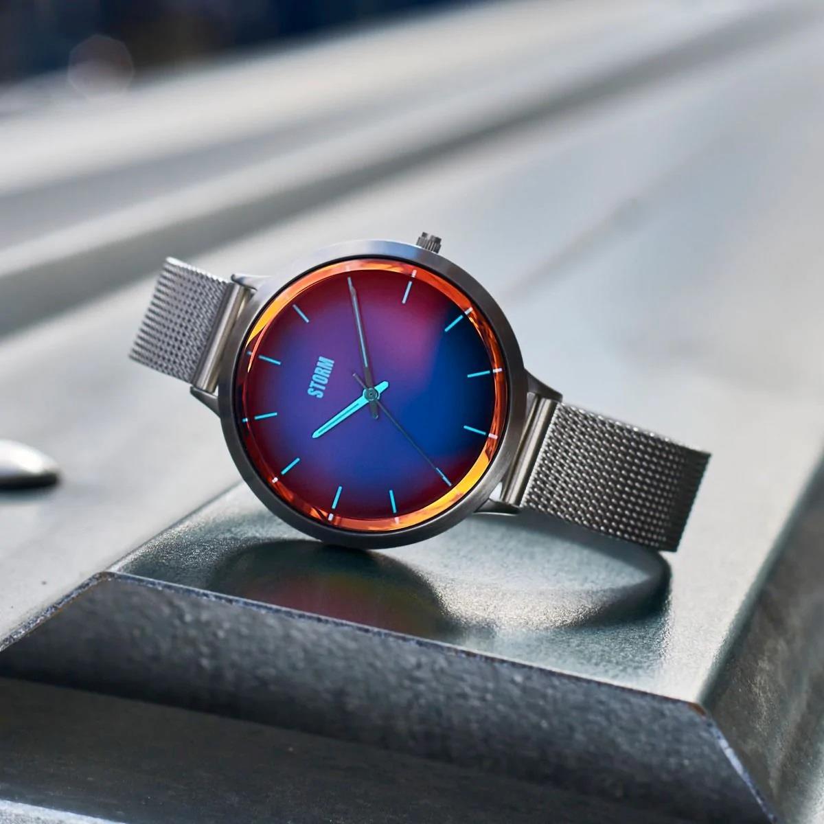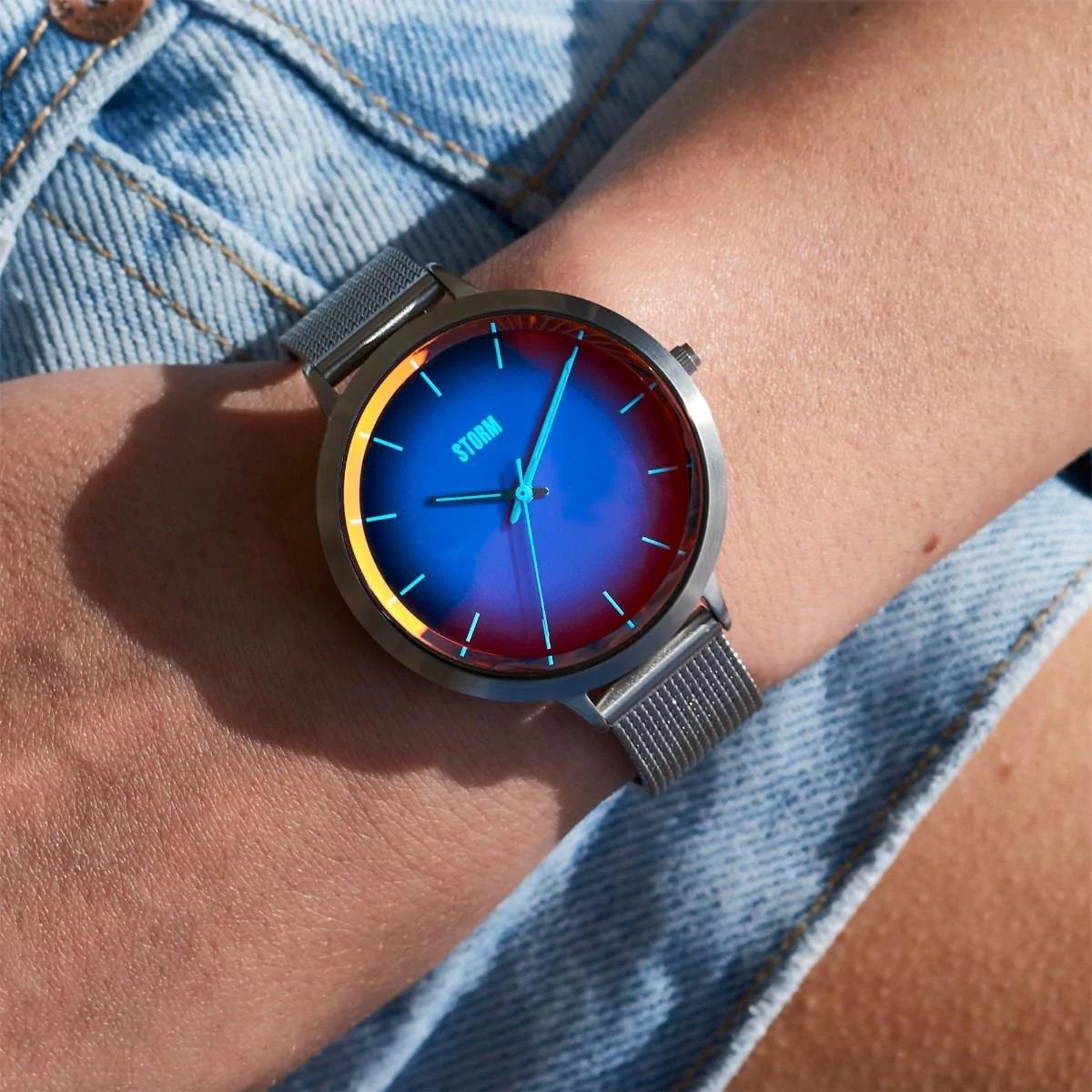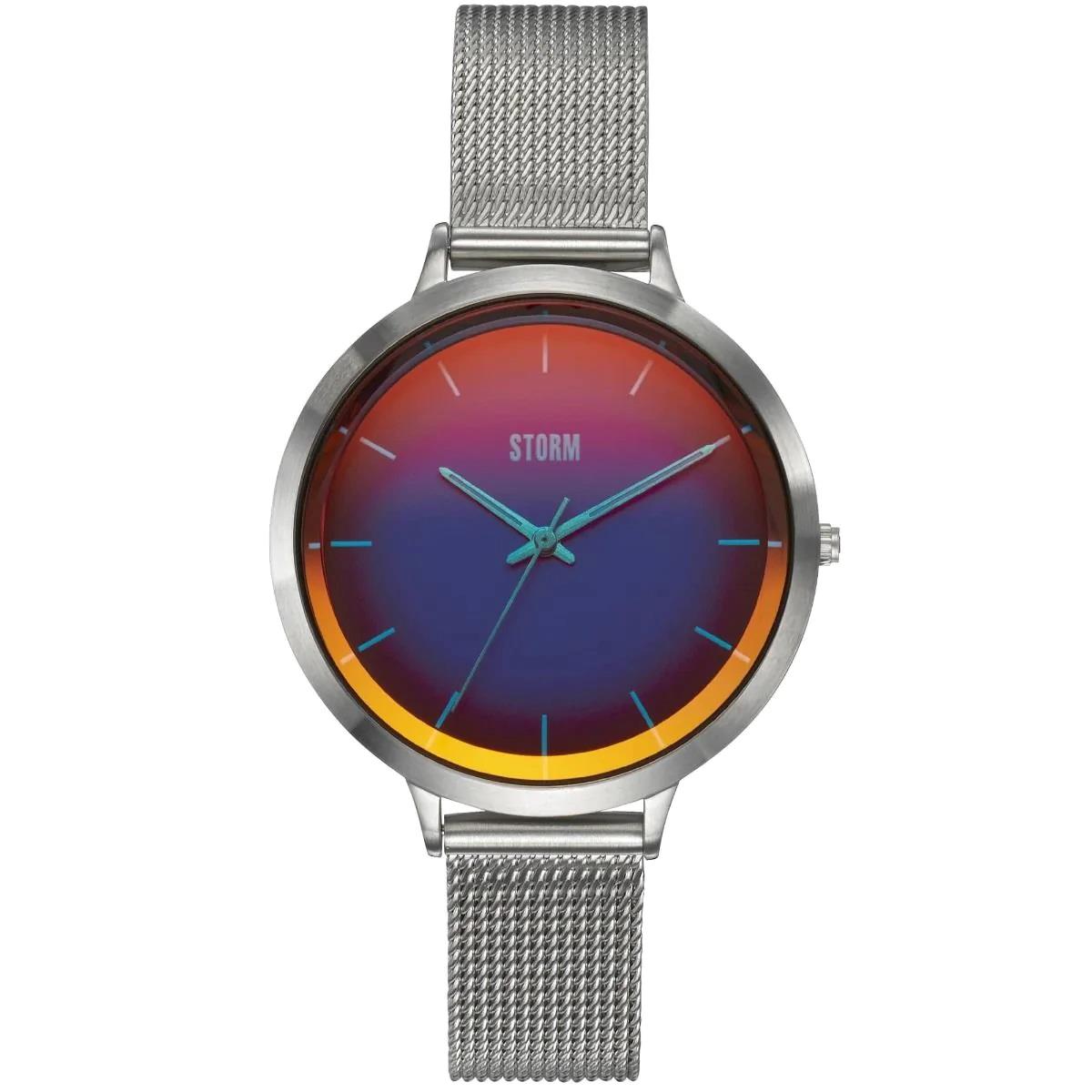 ساعت مچی زنانه STORM با طراحی روزانه بند حصیر بافت استیل و قاب گرد استیل و صفحه مشکی با شیشه رنگی و قابلیت داشتن شب نما و موتور ژاپنی و انرژی باتری و مقاومت در برابر اب تا عمق 50 متر به همراه دوسال گارانتی بین المللی