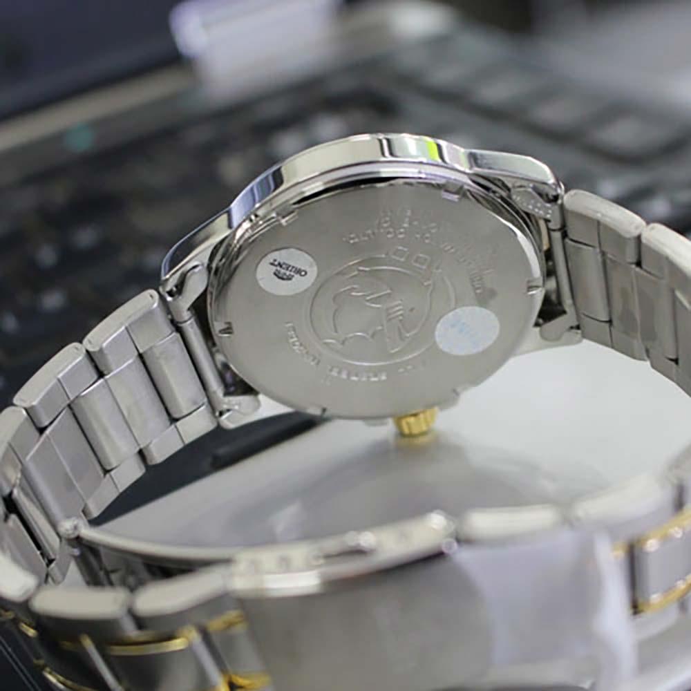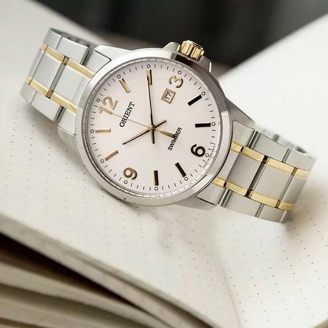 ساعت مچی مردانه اورینت orient با طراحی روزانه بند استیل طلایی و قاب استیل با صفحه گرد سفید و قابلیت تقویم ,شب نما با مو تور ژاپنی و مقاومت در برابر آب تا عمق 100 متر به همراه دو سال گارانتی بین المللی