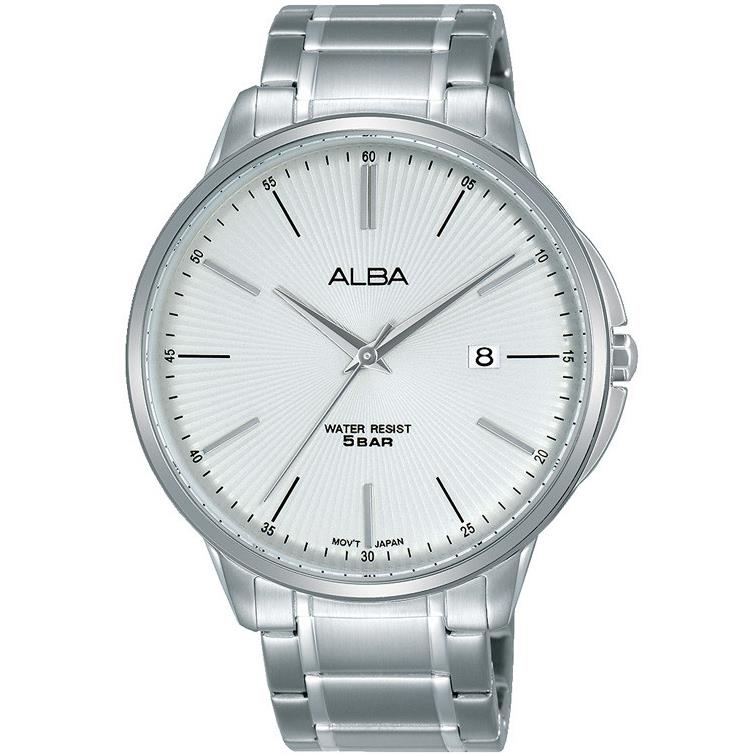 ساعت مچی مردانه آلبا alba با طراحی کلاسیک بند استیل ,قاب گرد استیل با صفحه گرد نقره ای و قابلیت داشتن تقویم با موتور ژاپنی و انرژی باطری و مقاومت در برابر آب تا عمق 50 متر به همراه دو سال گارانتی بین المللی