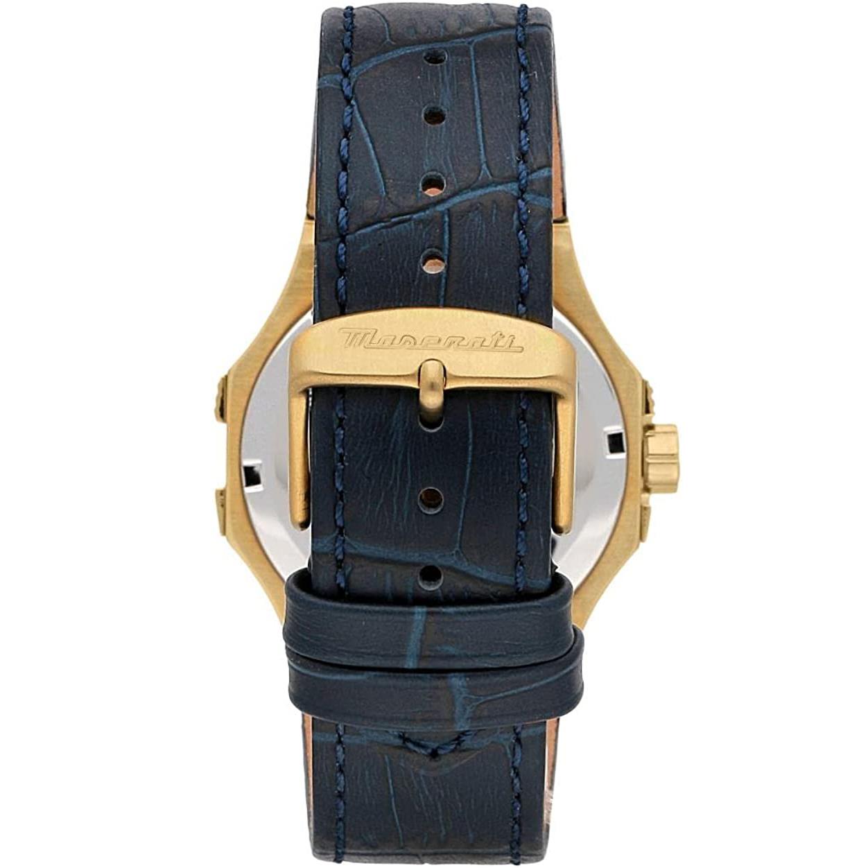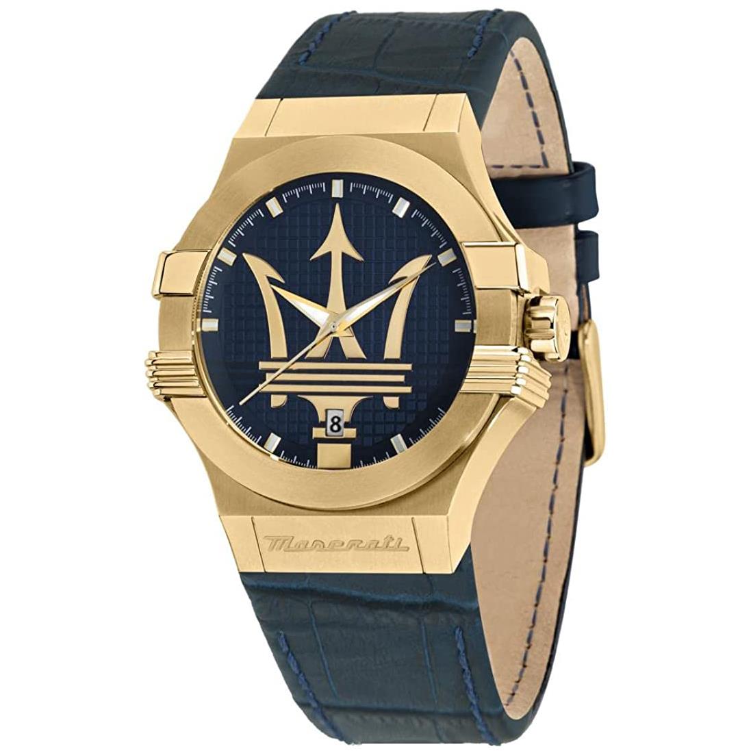 ساعت مچی مردانه مازراتی maserati با طراحی روزانه بند چرمی سرمه ای , قاب طلایی و صفحه گرد سرمه ای طلایی با قابلیت داشتن شب نما , تقویم و موتور ژاپنی با انرژی باتری و مقاومت در برابر آب تا عمق 100 متر به همراه دو سال گارانتی بین المللی