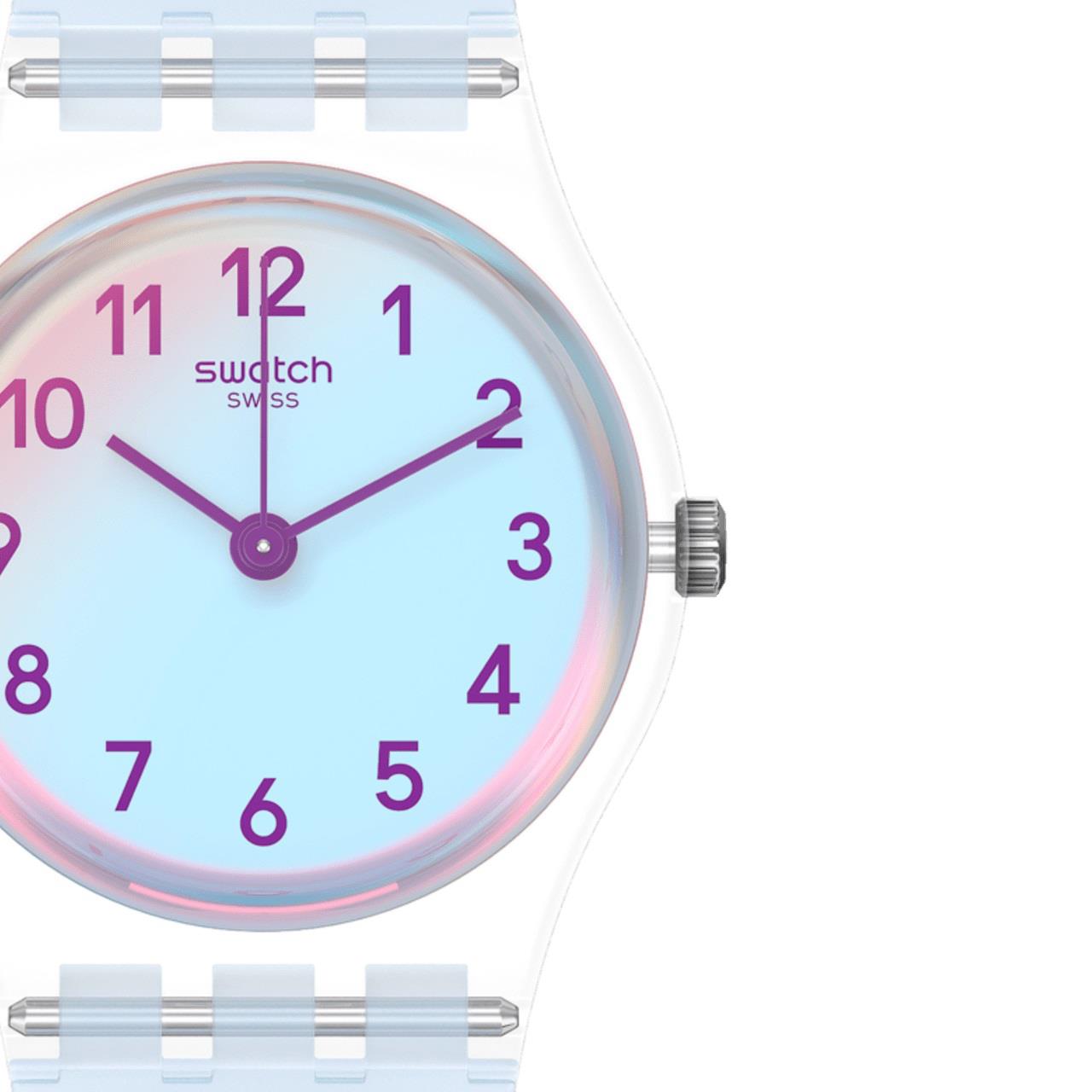 ساعت مچی زنانه سواچ SWATCH با طراحی روزانه بند سیلیکونی آبی با قاب پلاستیکی شیشه ای و صفحه گرد آبی و موتور سوییسی با انرژی باتری و قابلیت تقویم , روزهای هفته و مقاوم در برابر آب تا عمق 30 متر به همراه دو سال گارانتی بین المللی