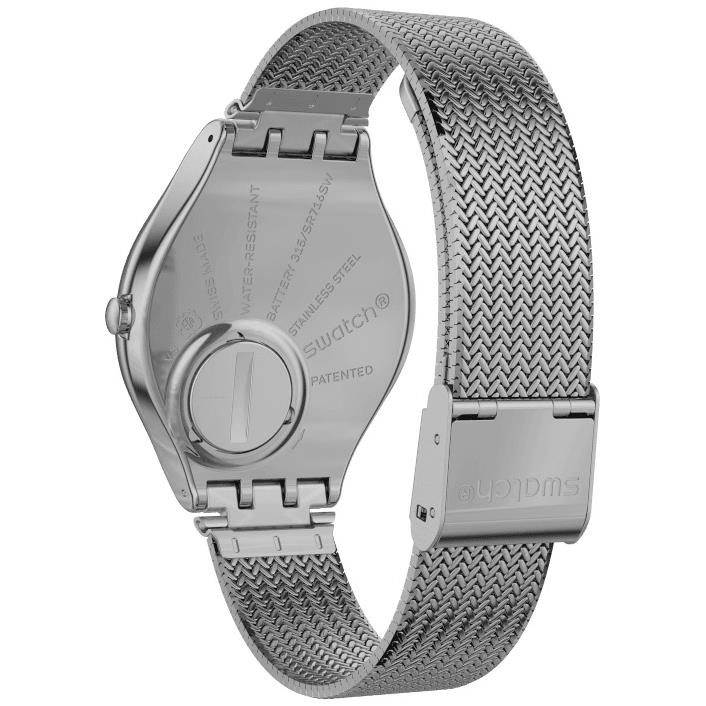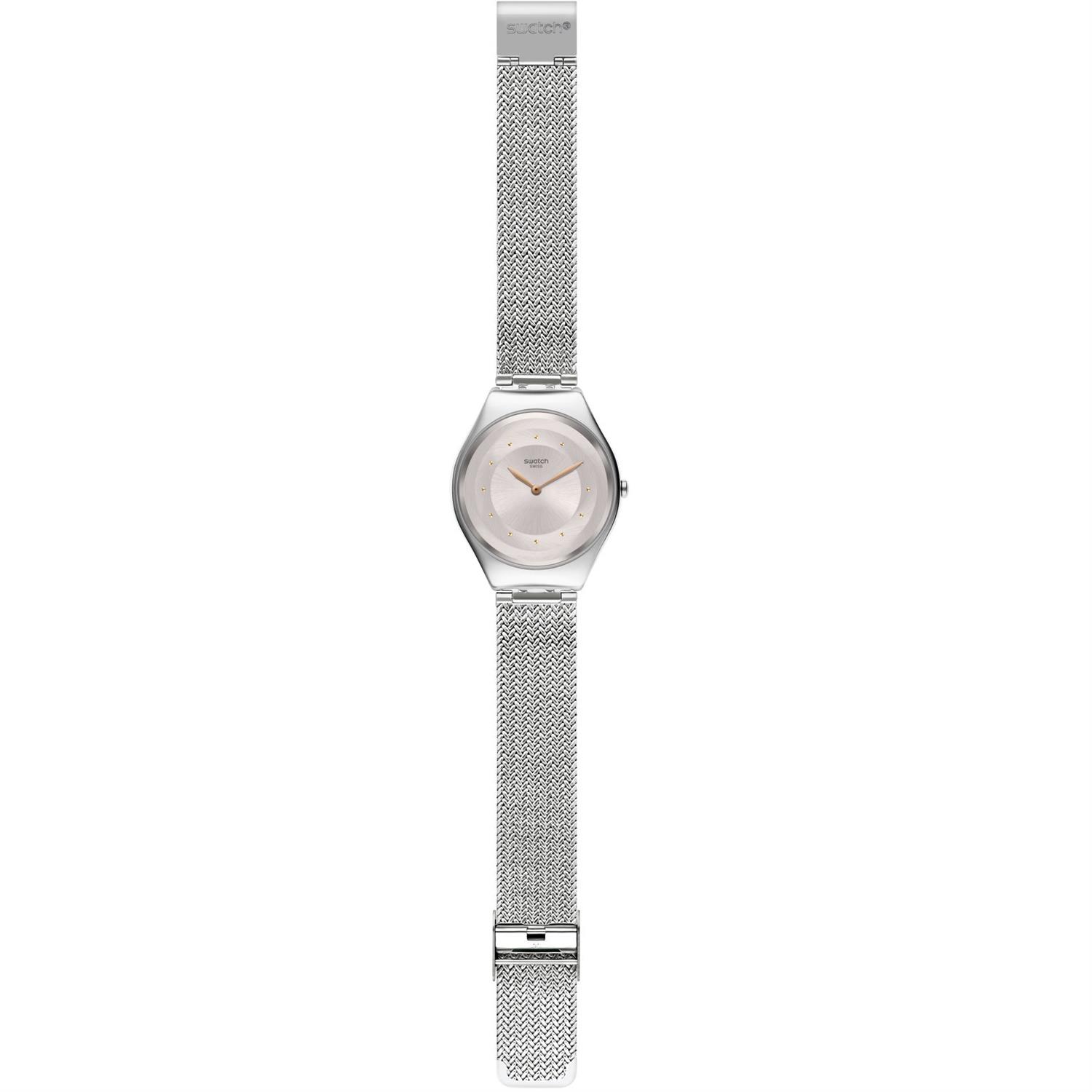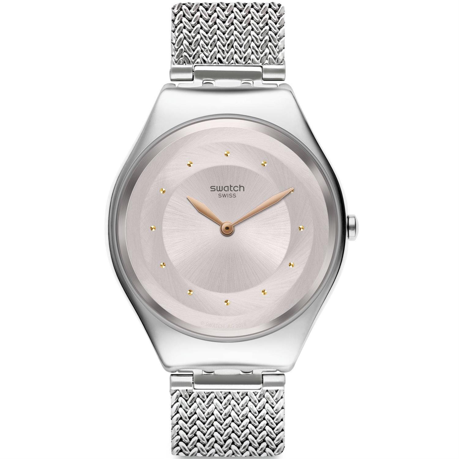 ساعت مچی زنانه سواچ SWATCH با طراحی روزانه بند حصیر بافت با قاب استیل و صفحه گرد نقره ای و موتور سوییسی با انرژی باتری و مقاوم در برابر آب تا عمق 30 متر به همراه دو سال گارانتی بین المللی