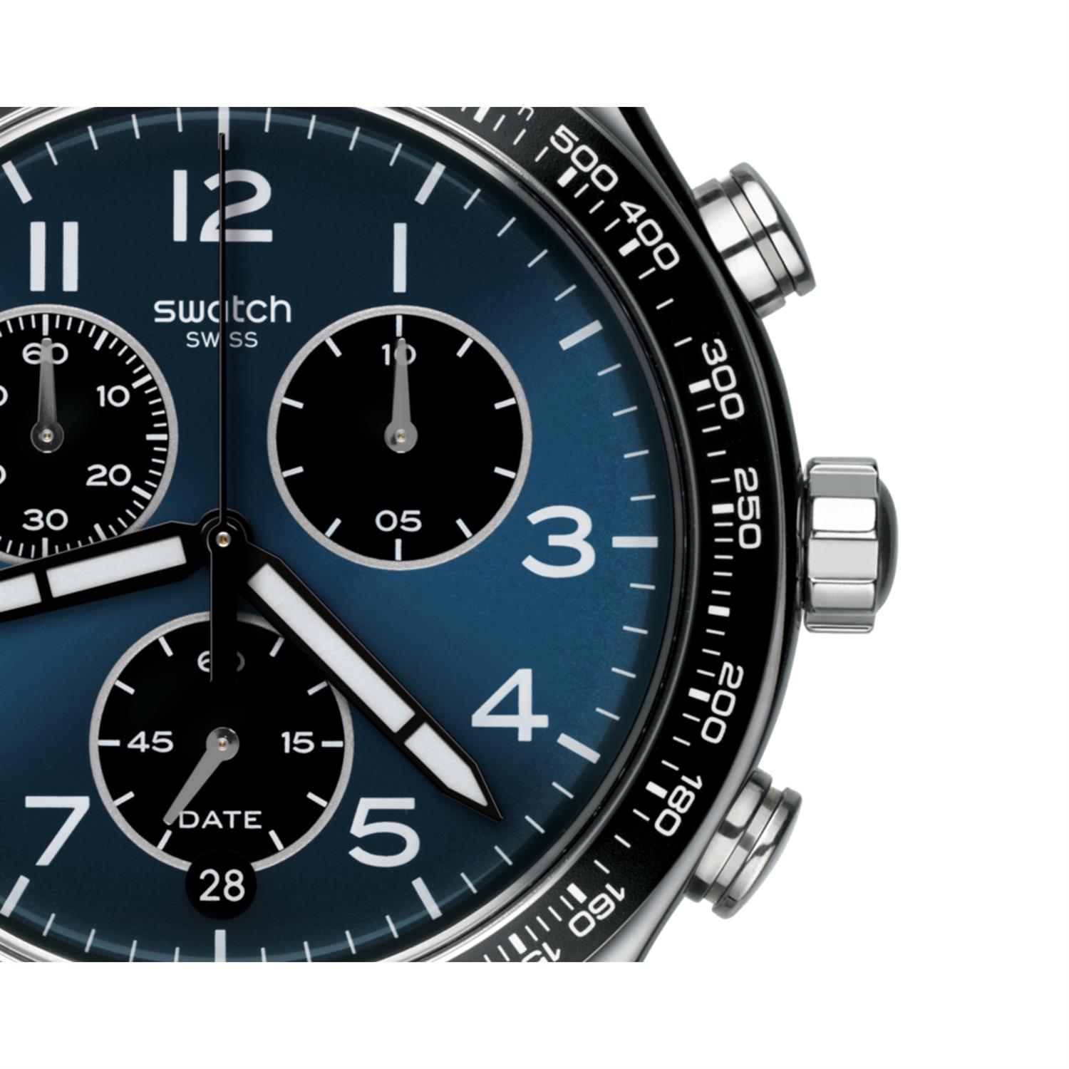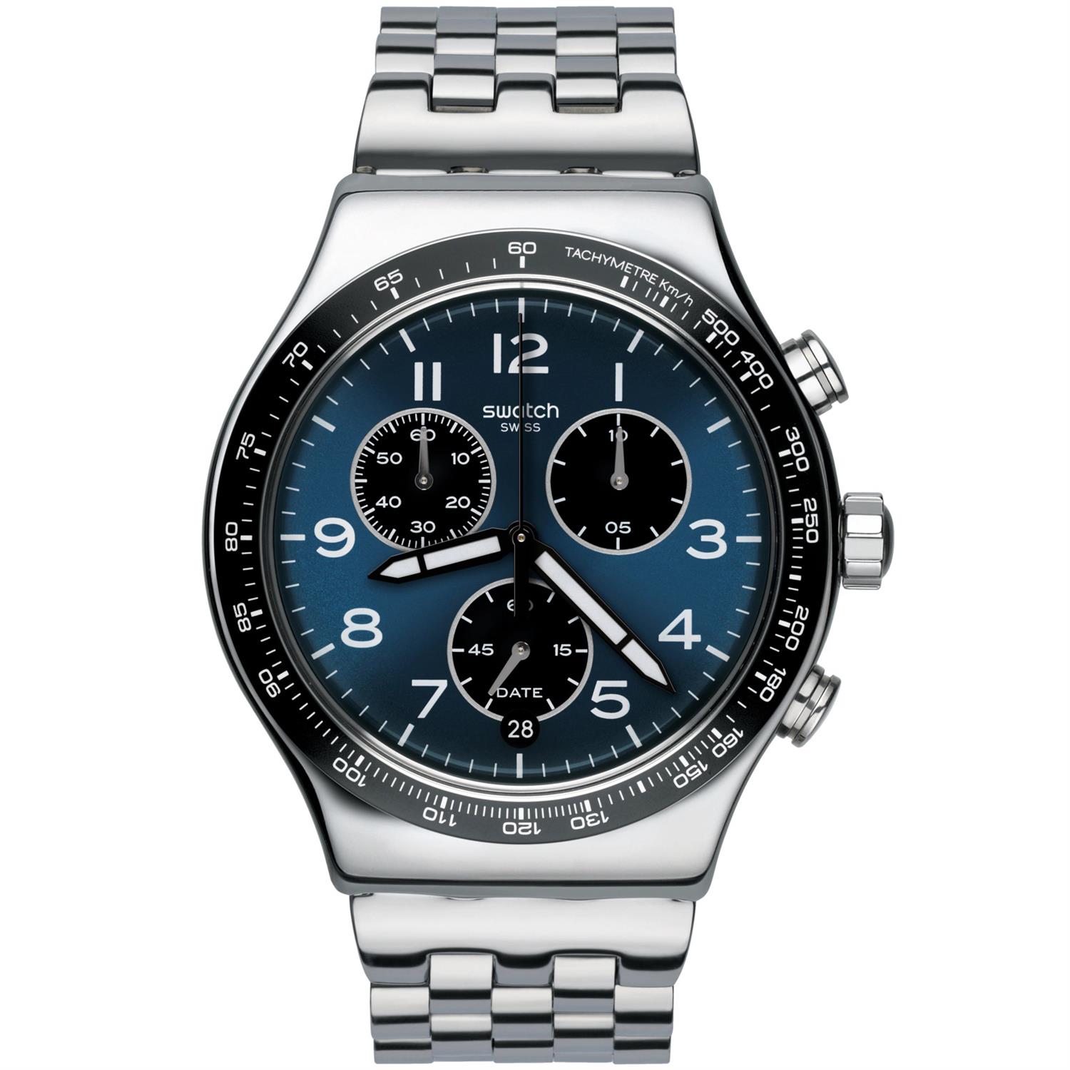 ساعت مچی مردانه سواچ SWATCH با طراحی روزانه بند استیل با قاب گرد دو رنگ و صفحه سرمه ای با موتور سوییسی و انرژی باتری و قابلیت شب نما, تقویم , زه تاچی متر ,کرنوگراف و مقاوم در برابر آب تا عمق 30 متر به همراه دو سال گارانتی بین المللی