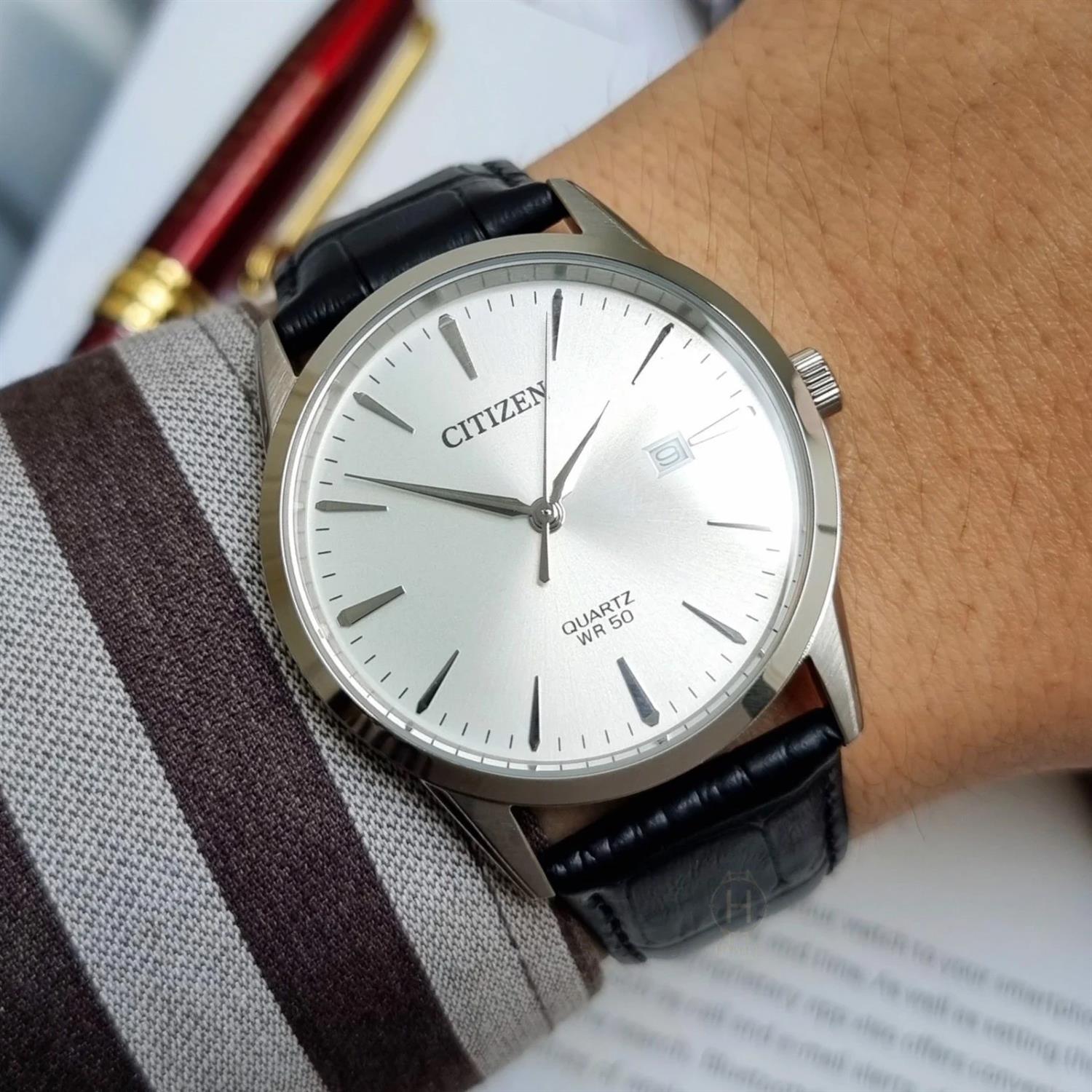 ساعت مچی مردانه سیتی زن CITIZEN با طراحی کلاسیک بند چرمی با قاب استیل و صفحه گرد نقره ای با قابلیت داشتن تقویم  و موتور ژاپنی با انرژی باتری و مقاوم در برابر آب تا عمق 50 متر به همراه دو سال گارانتی بین المللی