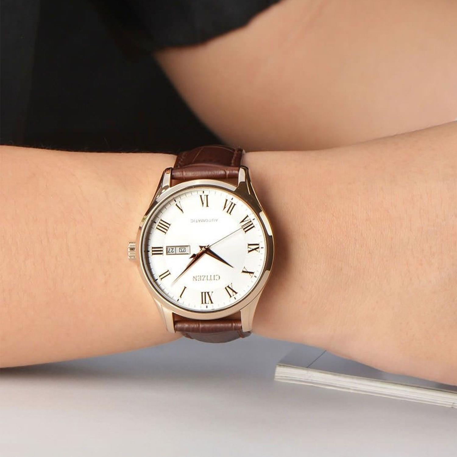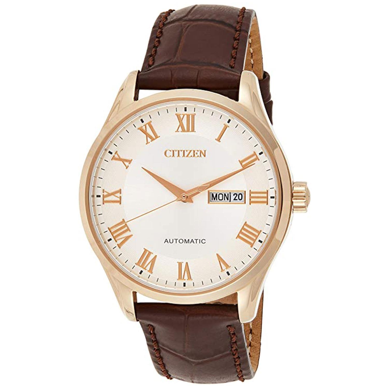 ساعت مچی مردانه سیتی زن CITIZEN با طراحی کلاسیک بند چرمی با قاب فلزی رزگلد و صفحه گرد سفید با قابلیت داشتن تقویم , روزهای هفته و موتور اتوماتیک ژاپنی با انرژی مکانیکی و مقاوم در برابر آب تا عمق 50 متر به همراه دو سال گارانتی بین المللی