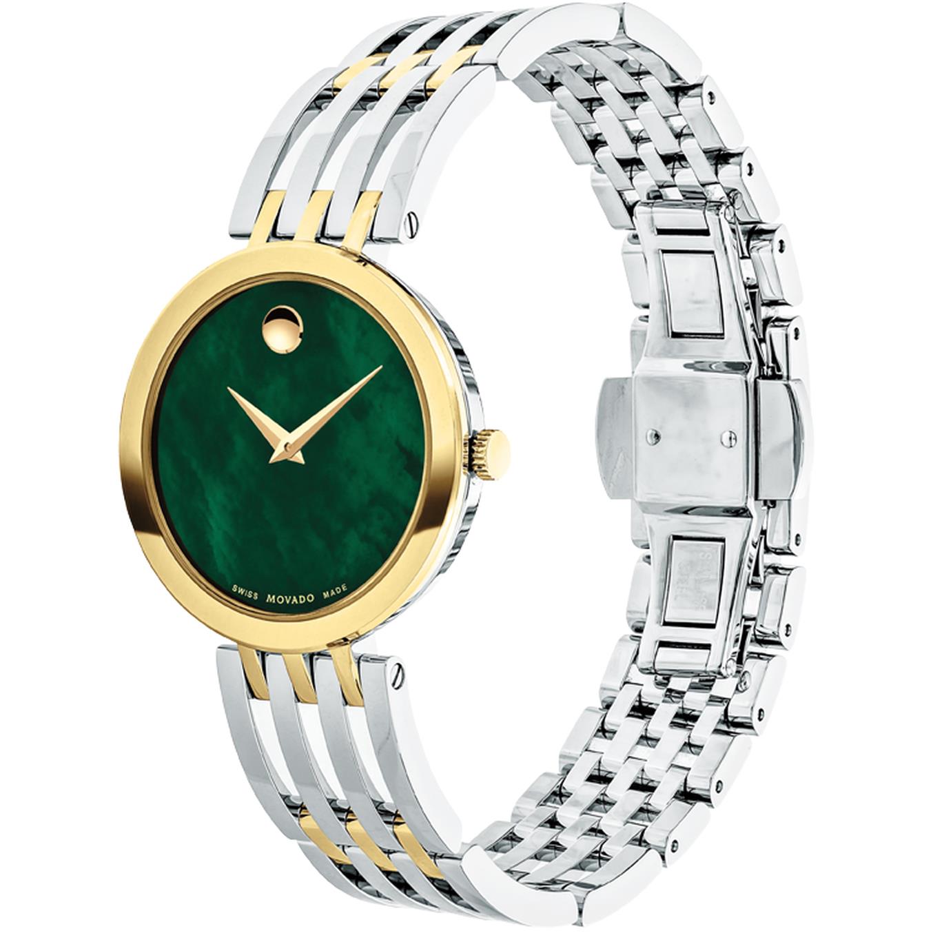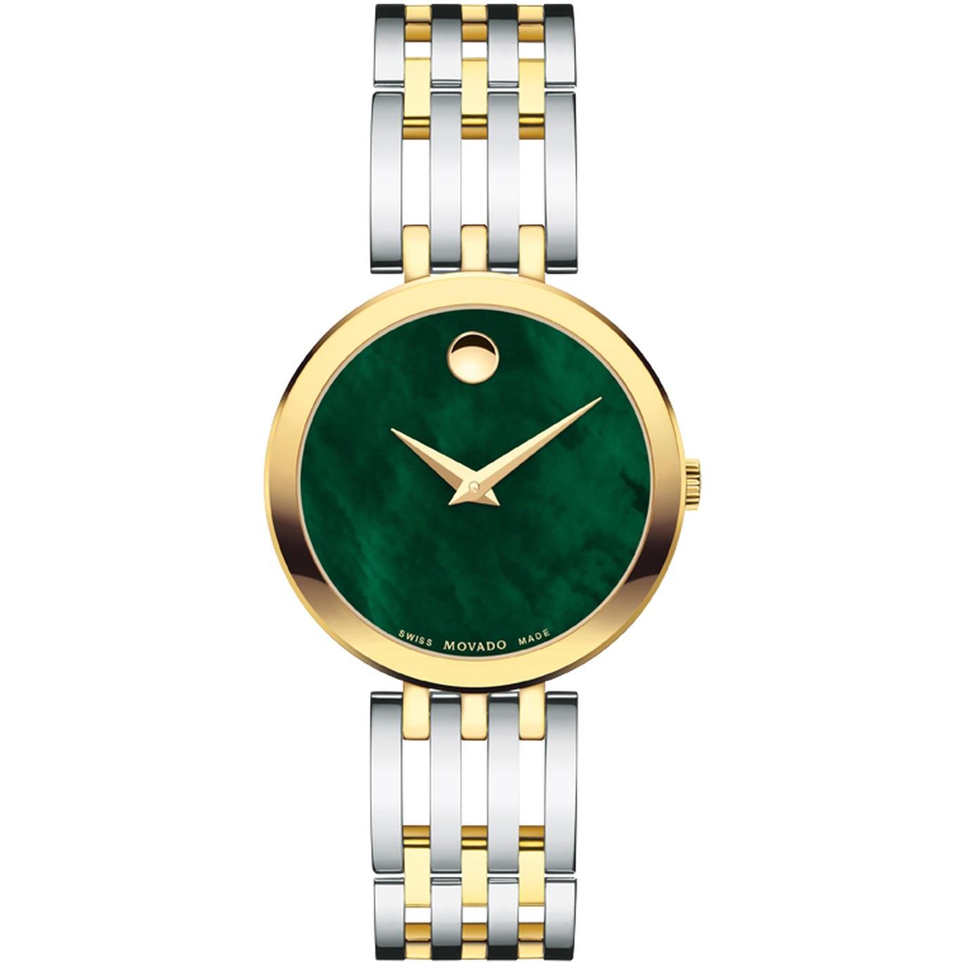 ساعت مچی زنانه movado با طراحی کلاسیک بند استیل طلایی و قاب گرد طلایی و صفحه سبز صدفی با شیشه ضد خراش و موتور سوئیسی با انرژی باتری و مقاومت در برابر آب تا عمق 30 متر به همراه دو سال گارانتی بین المللی