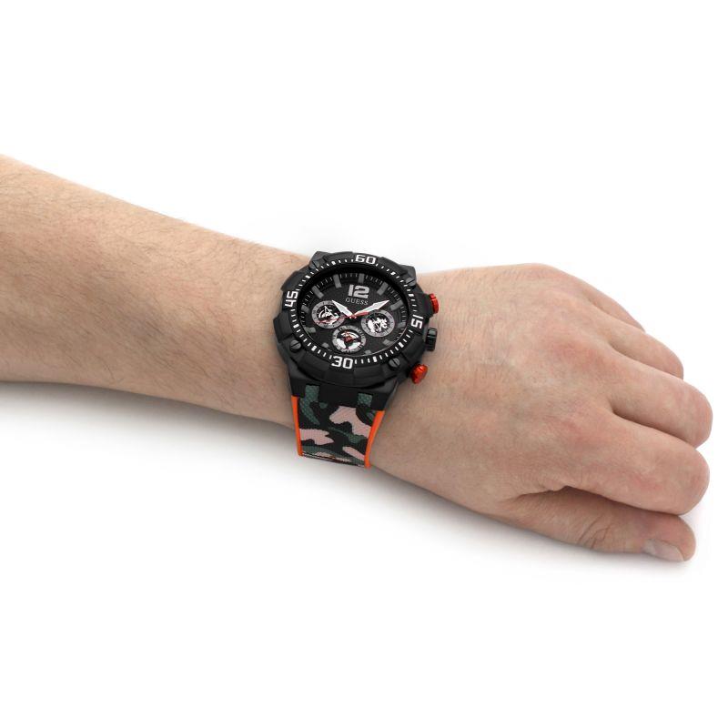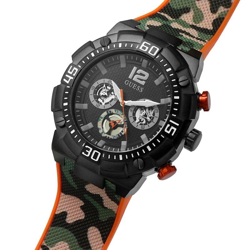 ساعت مچی مردانه گس GUESS با طراحی اسپرت بند سیلیکونی چند رنگ  و قاب گرد مشکی و صفحه مشکی با قابلیت داشتن تقویم , روزهای هفته, شب نما, روز و شب قلب باز با موتور ژاپنی و انرژی باتری و مقاومت در برابر آب تا عمق 50 متر به همراه دو سال گارانتی بین المللی