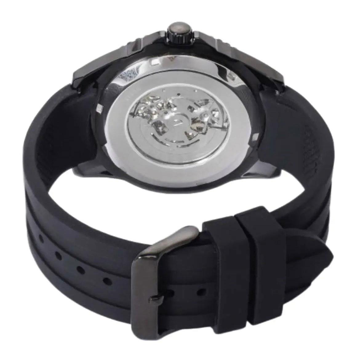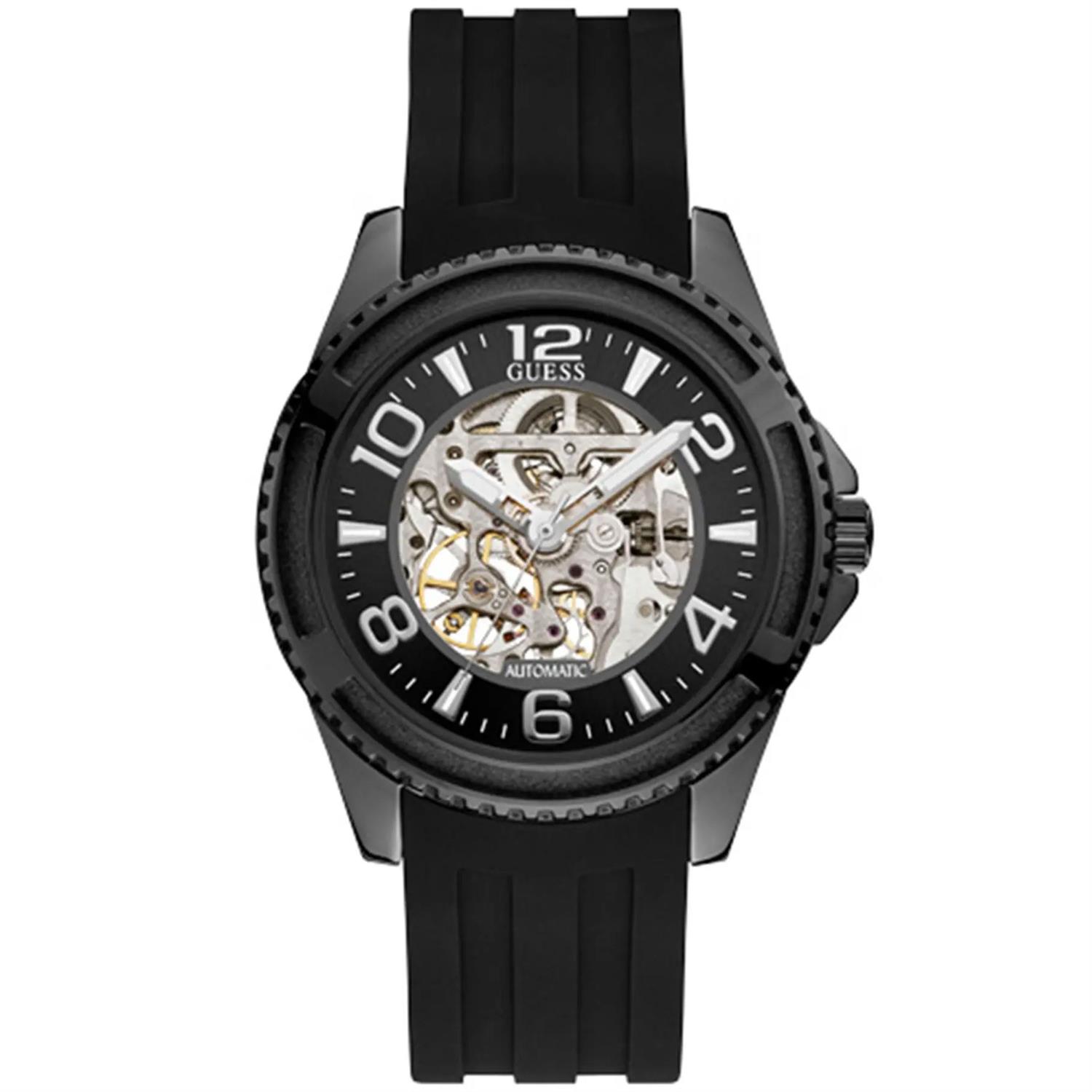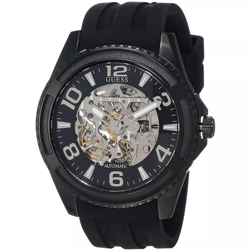 ساعت مچی مردانه گس GUESS با طراحی روزانه بند سیلیکونی مشکی  و قاب گرد مشکی و صفحه اسکلتون مشکی , موتور اتوماتیک ژاپنی با انرژی مکانیکی و قابلیت داشتن شب نما و مقاومت در برابر آب تا عمق 50 متر به همراه دو سال گارانتی بین المللی