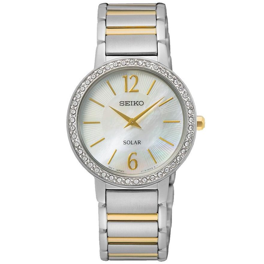 ساعت مچی زنانه  سیکو SEIKO با طراحی روزانه بند استیل طلایی با قاب دور نگین استیل و صفحه گرد سفید صدفی و موتور ژاپنی با انرژی نوری و مقاومت در برابر آب تا عمق 30 متر به همراه دو سال گارانتی بین المللی
