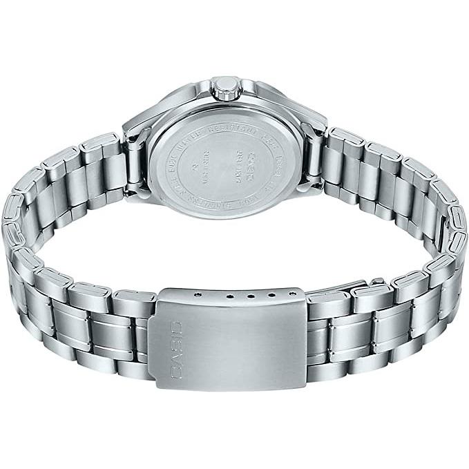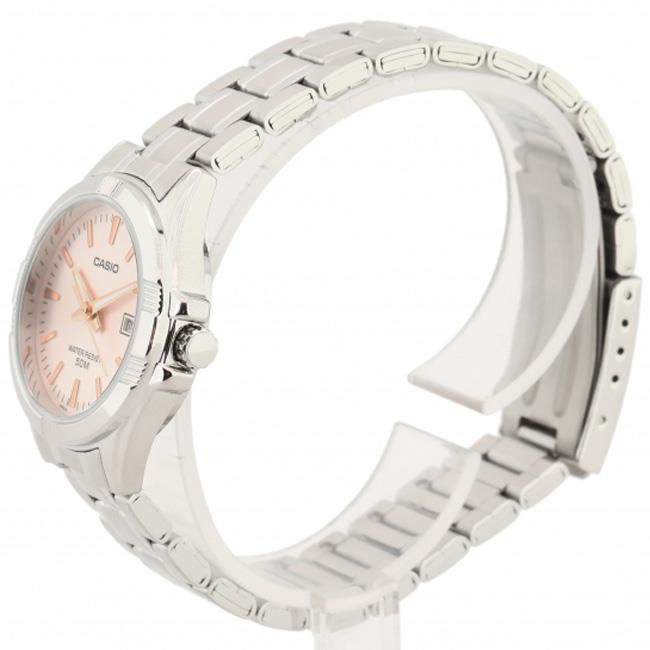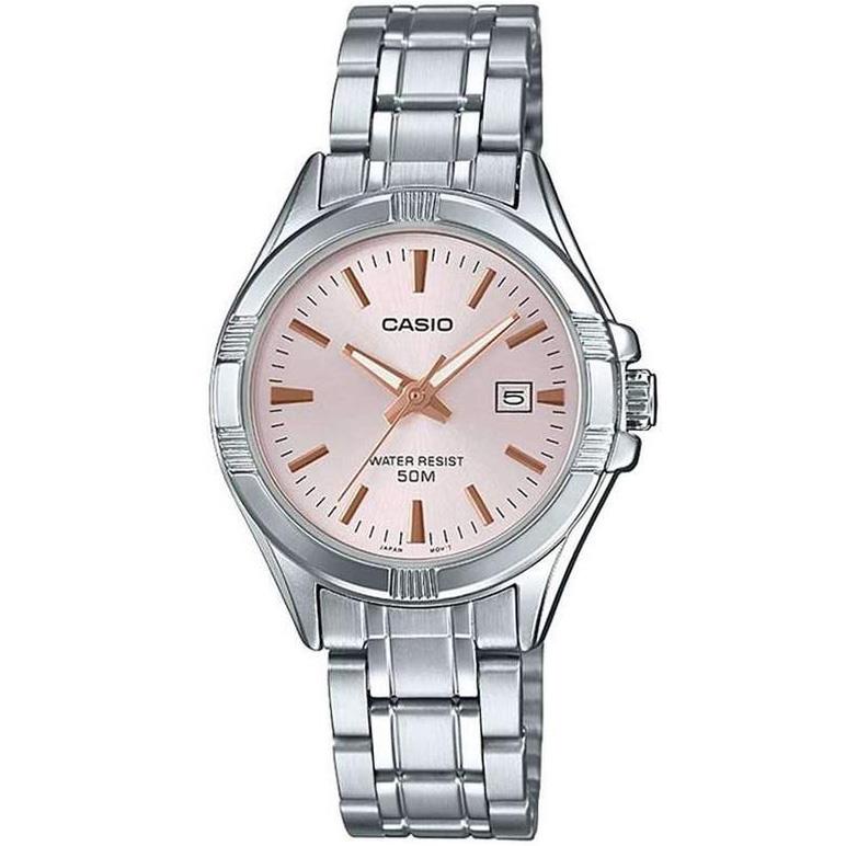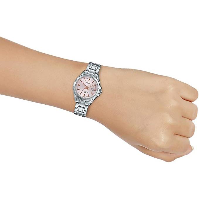 ساعت مچی زنانه کاسیو CASIO با طراحی روزانه بند استیل و قاب گرد استیل با صفحه گرد صورتی با موتور ژاپنی و انرژی باتری و قابلیت تقویم , شب نما و مقاومت در برابر آب تا عمق 50 متر به همراه دو سال گارانتی بین المللی