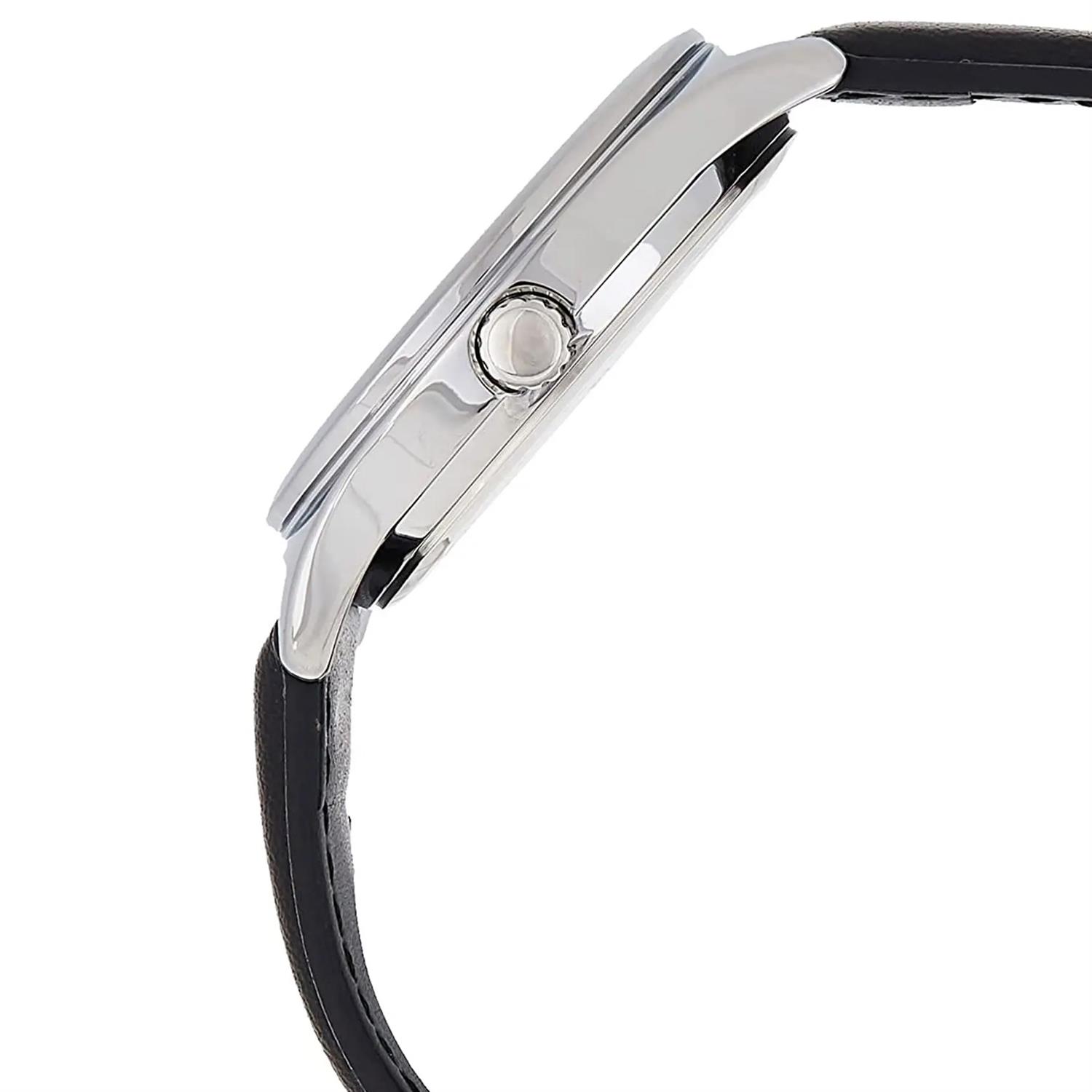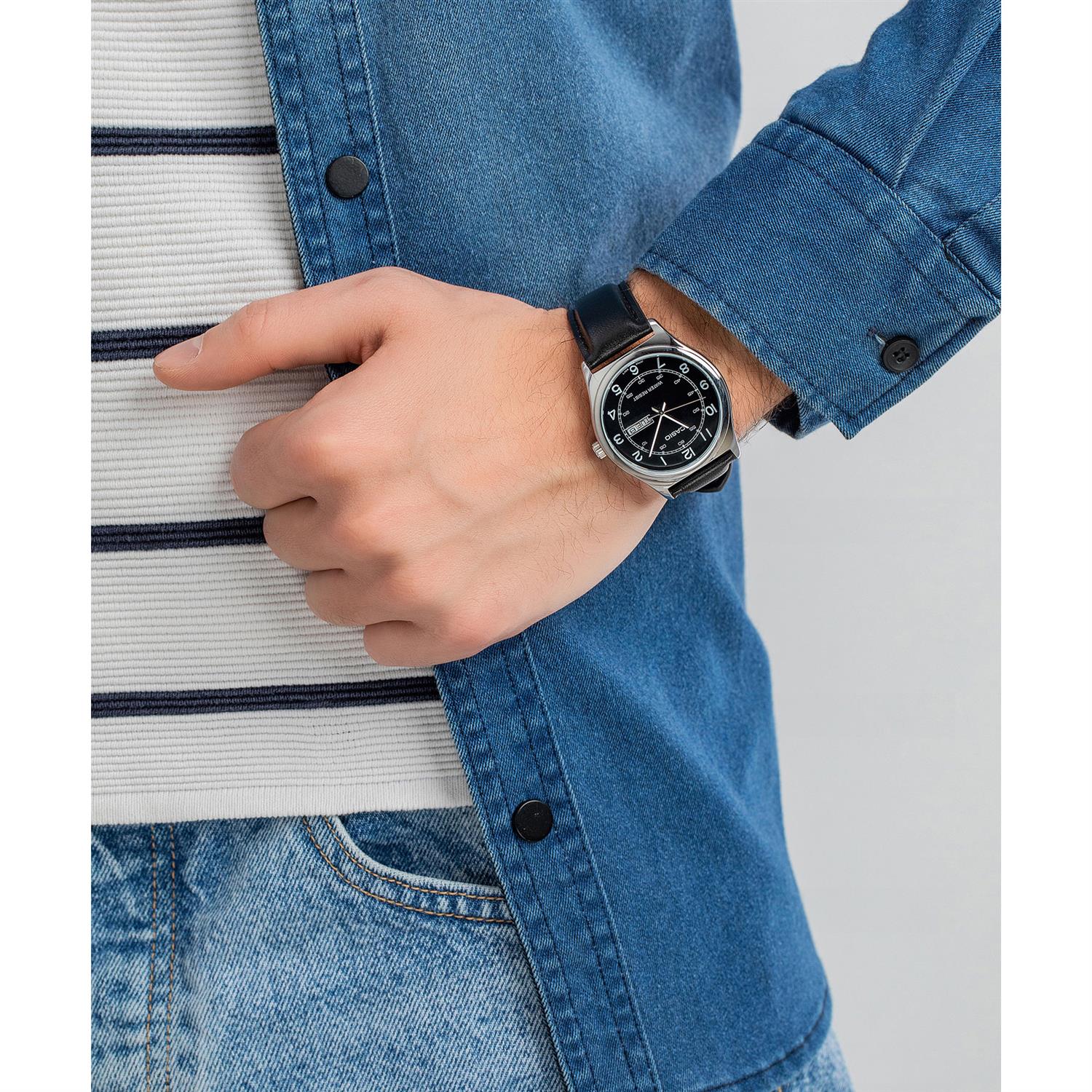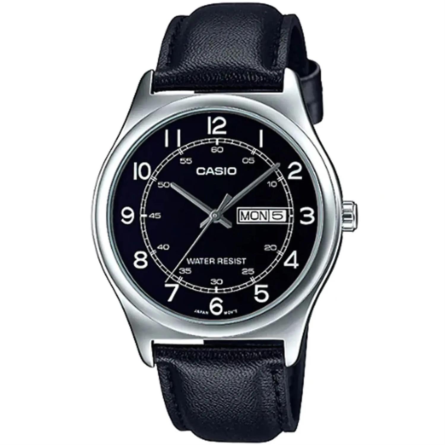 ساعت مچی مردانه کاسیو CASIO با طراحی روزانه بند چرمی مشکی و قاب استیل و صفحه گرد مشکی با موتور ژاپنی و انرژی باتری و قابلیت تقویم , روزهای هفته و مقاومت در برابر آب تا عمق 30 متر به همراه دو سال گارانتی بین المللی