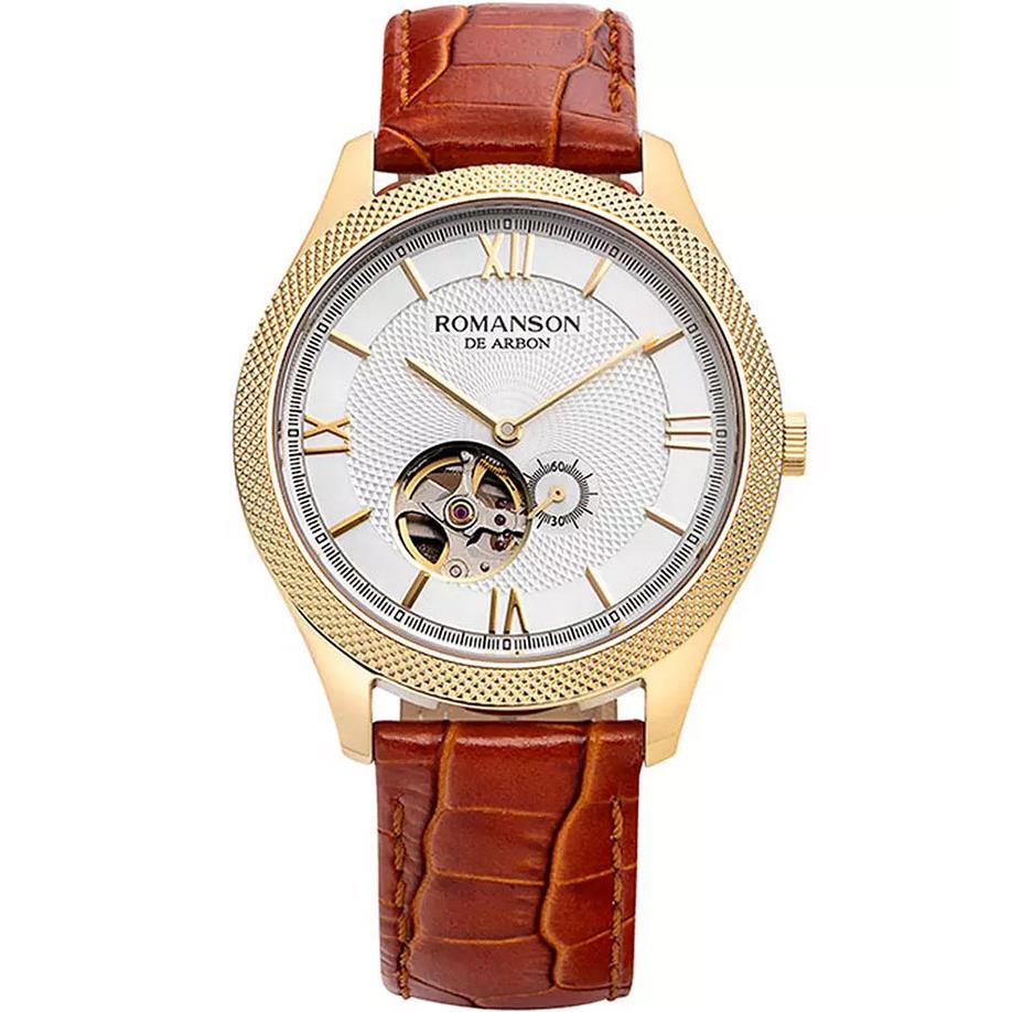 ساعت مچی مردانه رومانسون ROMANSON با طراحی روزانه بند چرمی قهوه ای با قاب گرد طلایی وصفحه سفید قلب باز و موتور سوییسی با انرژی باطری وقابلیت داشتن زیر ثانیه و مقاوم در برابر آب تا عمق 30 متر به همراه دو سال گارانتی بین المللی